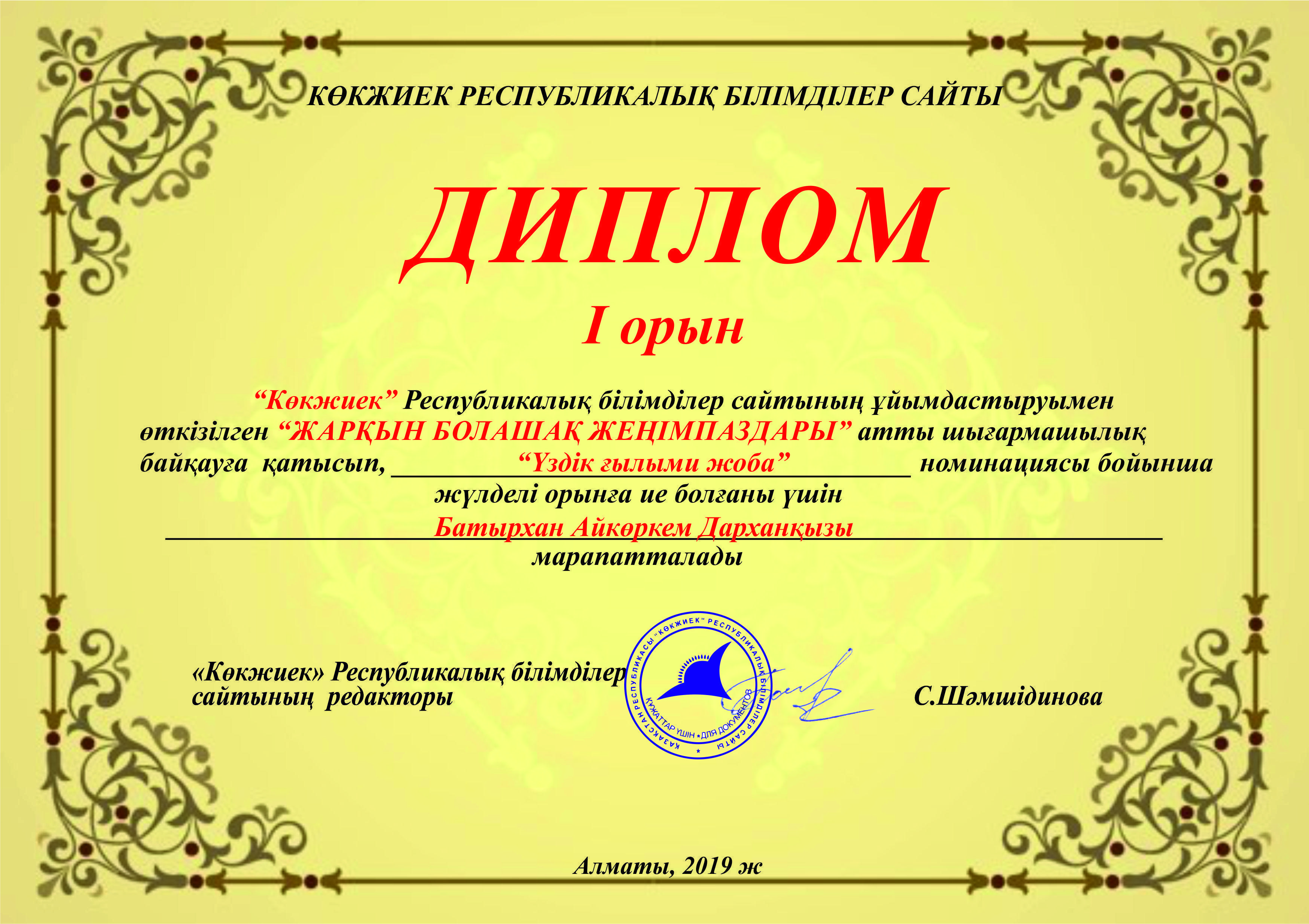 "Көкжиек" республикалық білімділер сайтының ұйымдастыруымен өткізілген "Жарқын болашақ жеңімпаздары" атты шығармашылық байқауға қатысып, "Үздік ғылыми жоба" номинациясы бойынша жүлделші орынға ие болған мектебіміздің 1-сынып оқушысы Батырхан Айкөркем марапатталды. Жеңісің құтты болсын, жас өркен!