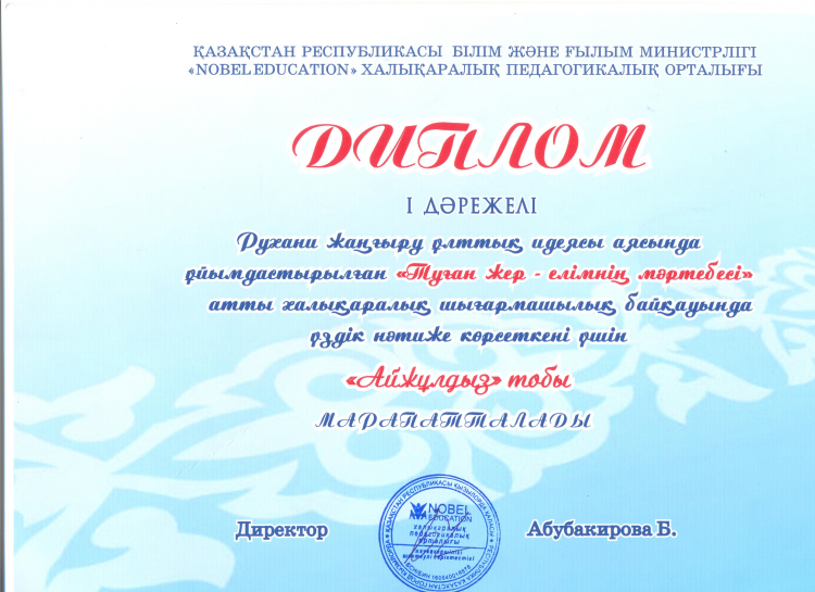 "NOBELEDUCATION" Халықаралық педагогикалық орталығының "Рухани жаңғыру" ұлттық идеясы аясында ұйымдастырған "Туған жер - елімнің мәртебесі" атты халықаралық шығармашылық байқауында үздік нәтиже көрсеткен мектебіміздің "Айжұлдыз" қыздар би тобы І дәрежелі димлом мен медальдармен марапатталды.