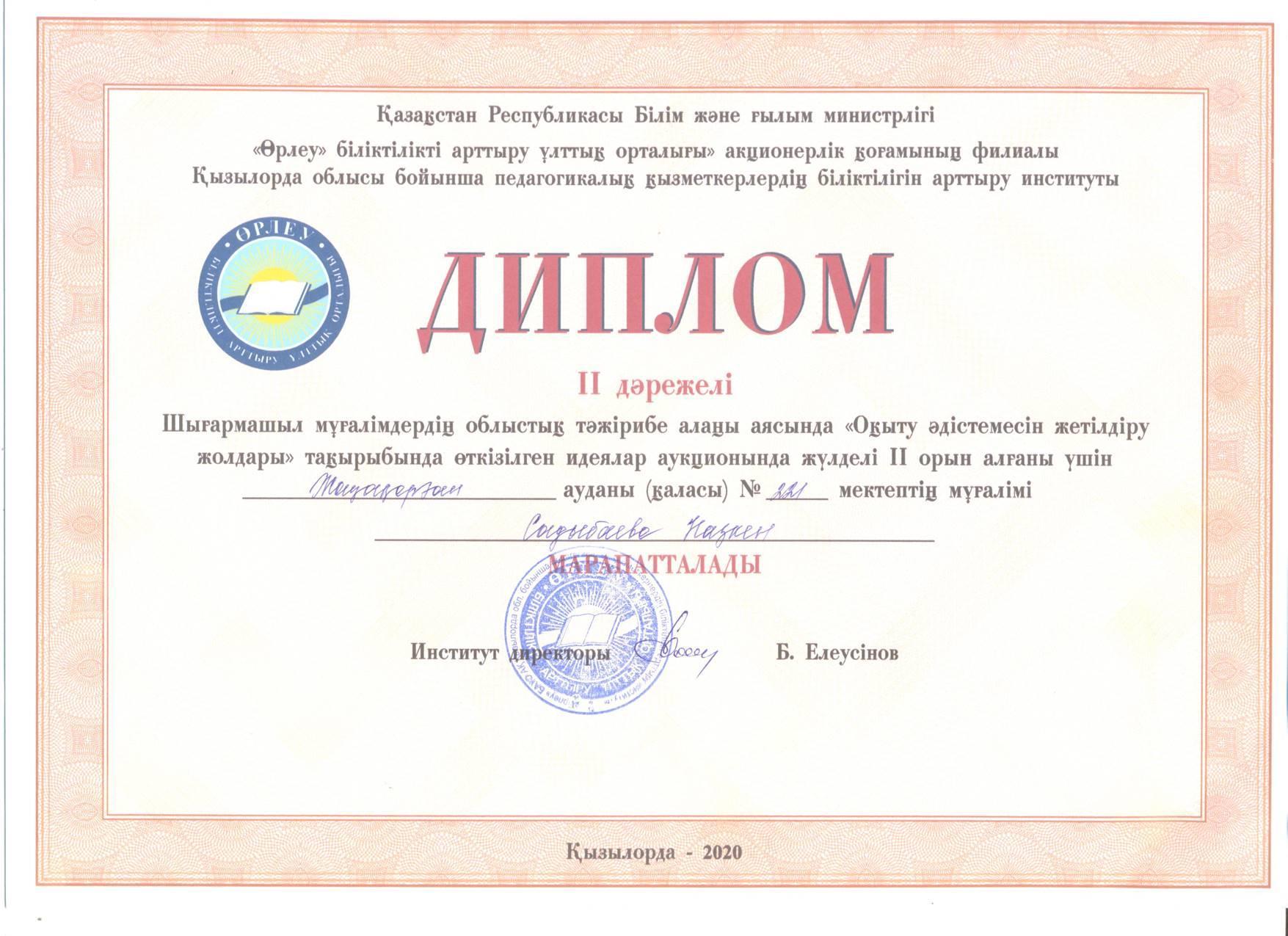 2020 жылдың 2-5 қаңтар аралығында Жаңақорған ауданында ""Өрлеу" біліктілікті арттыру ұлттық орталығы" акционерлік қоғамының филиалы Қызылорда облысы бойынша педагогикалық қызметкерлердің біліктілігін арттыру институтының ұйымдастыруымен шығармашыл мұғалімдердің облыстық тәжірибе алаңы болып өтті. Тәжірибе алаңына №221 негізгі орта мектебінен екі мұғалім қатысты. Қазақ тілі мен әдебиеті пәнінің мұғалімі Б.Жоланов тәжірибе алаңының сарапшылар қатарынан көрінсе. информатика пәні мұғалімі Н.Садыбаева аудандық құраманың мүшесі ретінде додаға қатысты. Информатика пәні мұғалімі Н.Садыбаева шығармашыл мұғалімдердің облыстық тәжірибе алаңы аясында "Оқыту әдістемесін жетілдіру жолдары" тақырыбында өткізілген идеялар аукционында өзінің МАДС және 1-сынып мұғалімдері мен ата-аналарына арнап әдістемелік көмек құралы ретінде жасаған мобильдік қосымшасы "Spelling" әділ қазылар алқасына ұсынды. Әділ қазылар мен тәжірибе алаңының сарапшыларының бағалауымен үздік деп танылған идея жүлделі ІІ орынға ие болды.