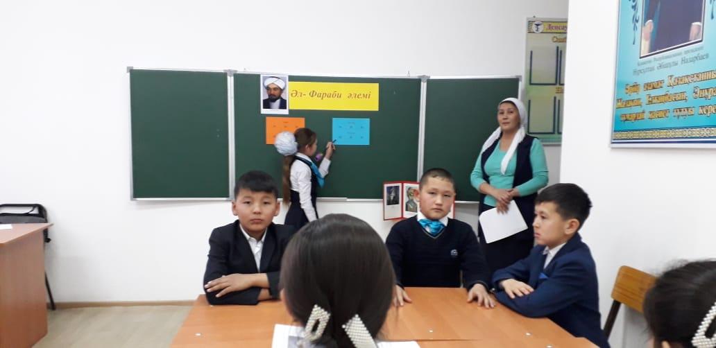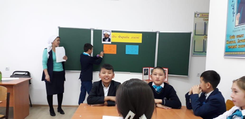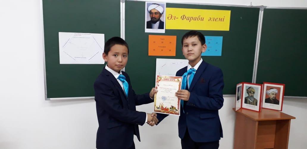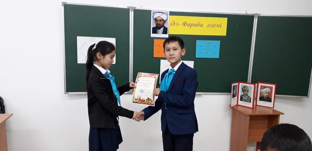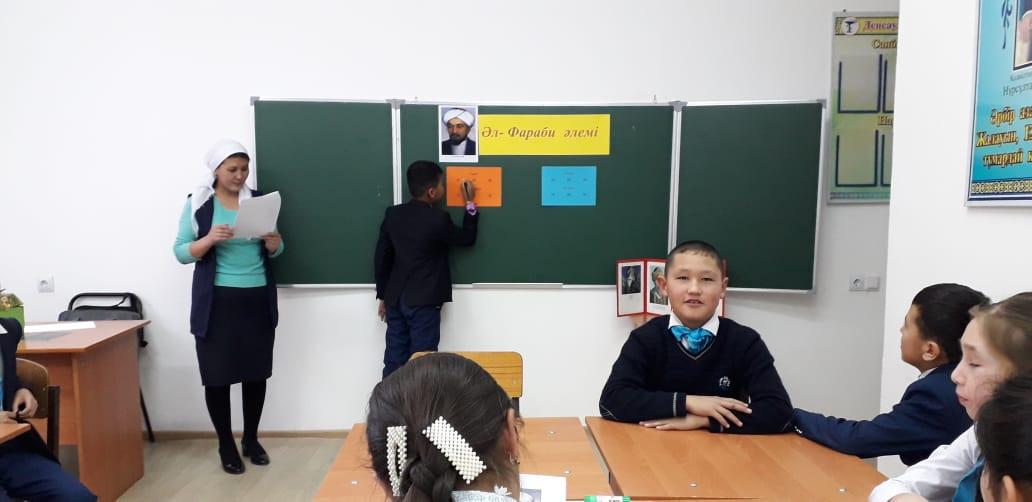 Әлемнің екінші ұстазы Әбу Насыр Әл-Фарабидің туылғанына 1150 жыл толу аясында 14 қаңтар 2020 жылы тарих-география пәні мұғалімі Байдулла Мөлдір "Әл-Фараби әлемі" атты интеллектуалды сайыс өткізді. Мақсаты жас ұрпаққа халқымыздың тарихын тереңдете оқытып, тәрбиені ұлттық бағытта өрістету ісінде танымдық ойын арқылы ежелгі замандағы Отырар топырағында туған, халқымызға мол мұра қалдырған ғалым Әбу Насыр Әл-Фарабидің өмір жолдарымен, тарихтағы алатын орындарымен таныстыру. Сайысқа мектебіміздің 5-6 сынып оқушылары қатысып, топ болып сайысқа түсті. Сайыс 6-кезеңнен тұрды. әр кезеңде оқушыларға Әл-Фарабидің өмір жолына, шығармаларына, ғылымға қосқан үлесіне байланысты танымдық сұрақтар мен тапсырмалар беріліп отырды. Сайыс соңында өзінің танымдық деңгейін көрсетіп, жетістікке жеткен оқушылар марапатталды.