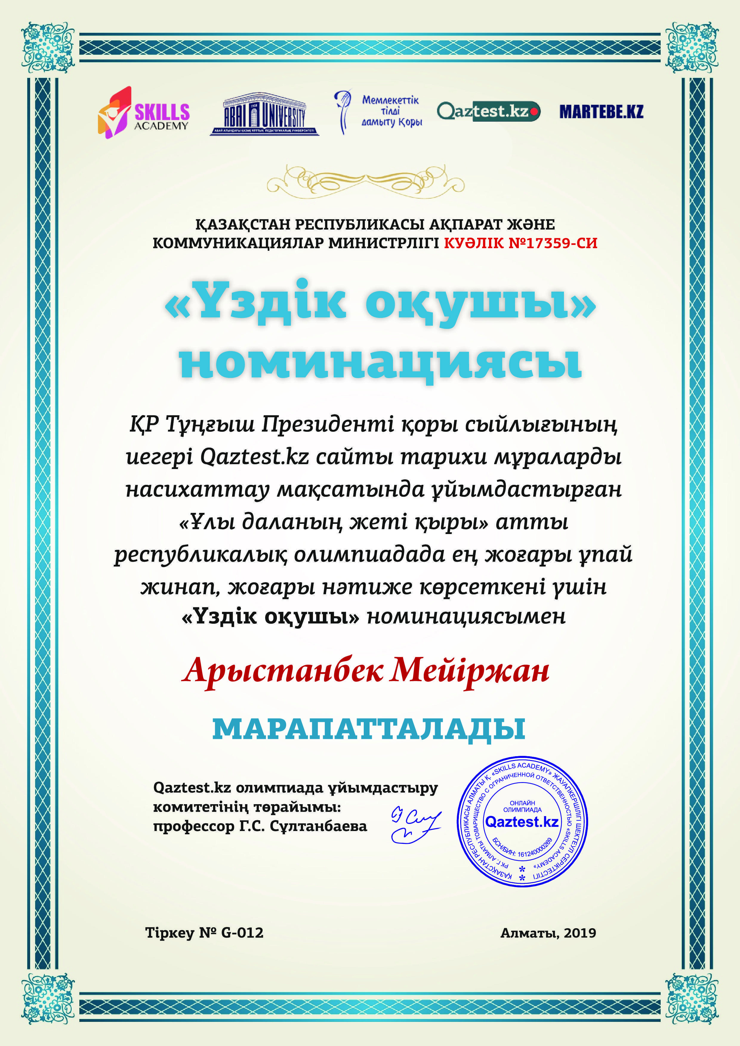 "Ұлы даланың жеті қыры" "Үздік оқушы" номинациясының иегері