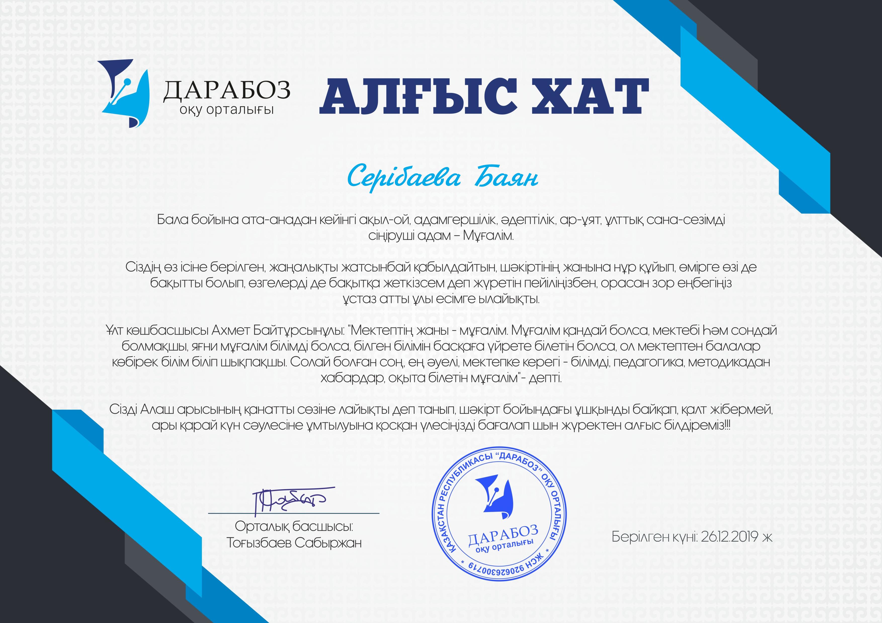 » » "Өнерлі өрге жүзер" байқауына жеңімпаздар дайындағаны үшін Алғыс хат