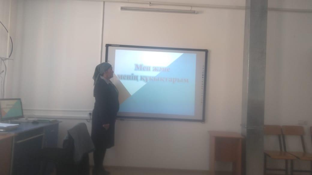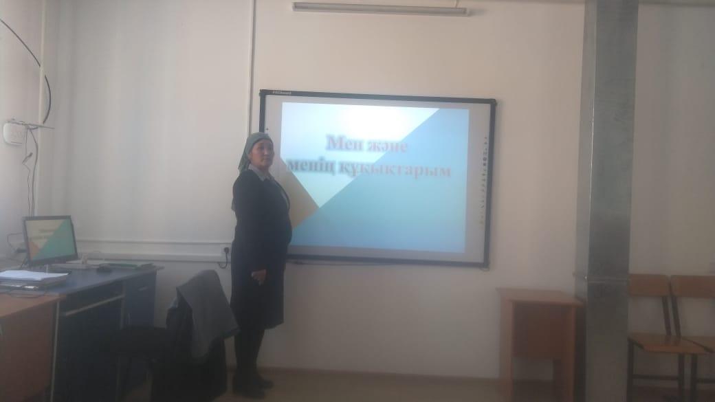 11.09.2020 жылы 7-сынып жетекшісі М.Бердіқожаева сынып оқушыларына "Құқық - әділет пен парасат жолы" тақырыбында тәрбие сағатын өткізді. Мақсаты : Оқушыларға адам құқықтары мен бостандықтары жайлы баптардан түсінік қалыптастыру, құқықтық білімдерін толықтыру. Оқушылардың саяси саналығы мен таным белсенділігін арттыру, заңдарды талдай отырып, өз беттерімен салыстыра білуге, өмірде қолдана білуге, ойлау қабілетін дамыту. Адамгершілік, ізгі қасиеттер мен ар – ождан бостандығына, адалдық пен мейірімділікке баулу арқылы құқықтық тәрбие беру.