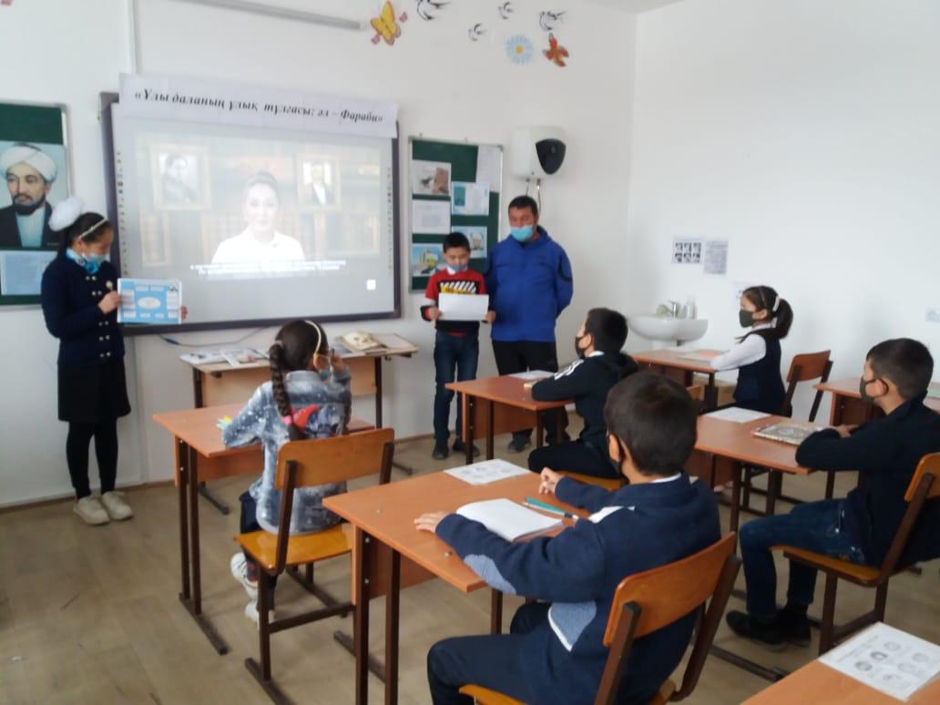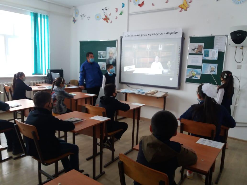 №221 негізгі орта мектебінде 2020 жылдың 26 қараша күні сынып жетекші А. Қожатаев 5 – сынып оқушыларына Әбу Насыр Әл – Фарабидың 1150 жылдығына орай «Ұлы даланың ұлы тұлғасы: әл - Фараби» тақырыбында тәрбие сағатын өтті. Тәрбие сағатында әл – Фараби туралы видео роликтер, слайдтар көрсетілді.