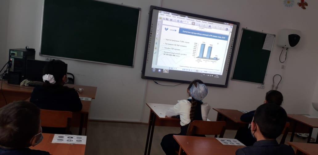 Аудандық білім бөлімінің 2020 жылғы 07 желтоқсандағы №03-11/4725 санды хатына сәйкес, №221 негізгі орта мектебінің 6-сыныбында «Буллингтың алдын алу» және «Төтенше жағдайлар тәуекелдерін төмендету» тақырыптарында сынып сағаты өткізілді. Сынып оқушылары Қазақстан Республикасының Білім және ғылым министрлігінің балалардың құқықтарын қорғау комитетімен ұсынылған балалардың құқықтарын қамтамасыз етуге бағытталған арнайы бейнероликтер топтамасын көрді.