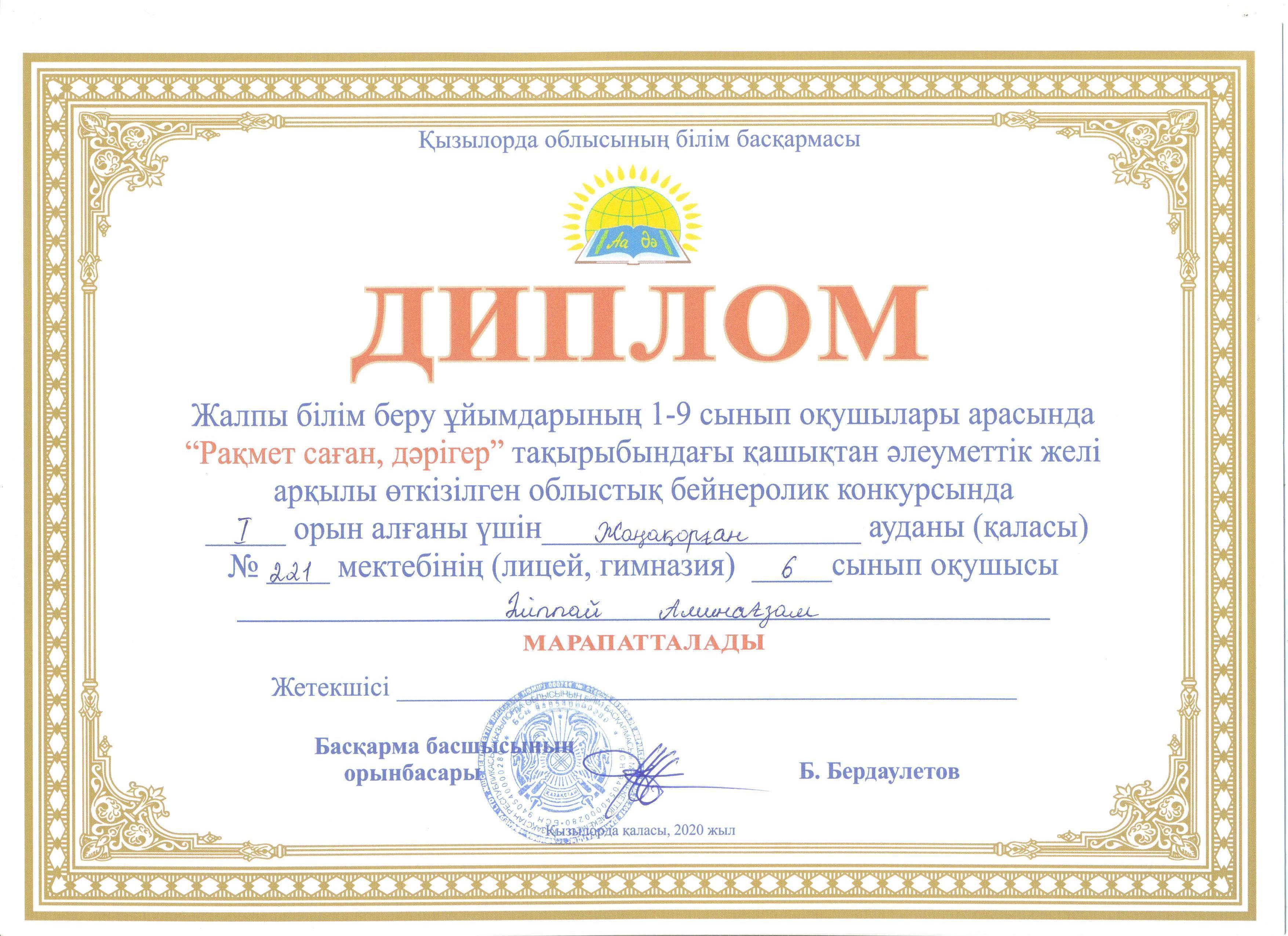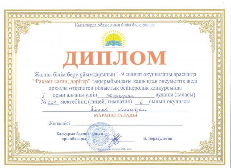 Қызылорда облысының білім басқармасының «Дарын» облыстық қосымша білім беру орталығының 2020-2021 оқу жылына арналған іс-шаралар жоспарына сәйкес жалпы білім беру ұйымдарының 1-9 сынып оқушылары арасында «Рақмет саған, дәрігер» тақырыбындағы қашықтықтан әлеуметтік желі арқылы облыстық бейнеролик конкурсын өткізілді. Аталған байқауға біздің мектептен 6-сынып оқушысы Әліппай Аминағзам және жетекшісі информатика пәнінің мұғалімі Садыбаева Назкен қатысты. Байқау ережесі бойынша еліміздегі төтенше жағдай кезінде өздерінің ерен еңбектерін көрсеткен ақ халатты абзал жандарға өз алғысын білдіру болатын. Байқау ережелерін толық орындап, 6-сынып оқушылары арасында жүлделі І орынды жеңіп алды.