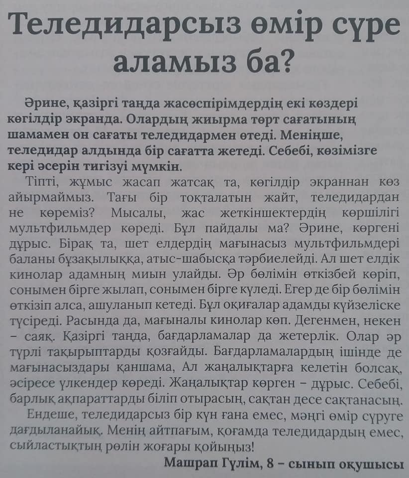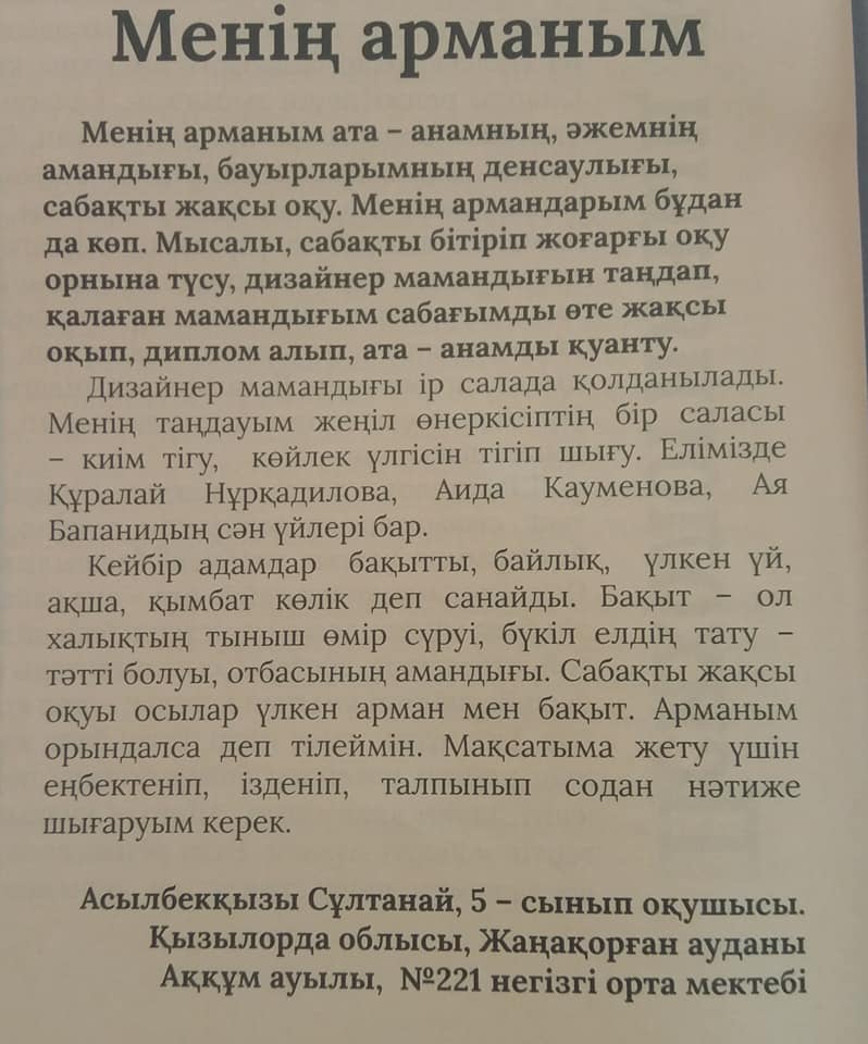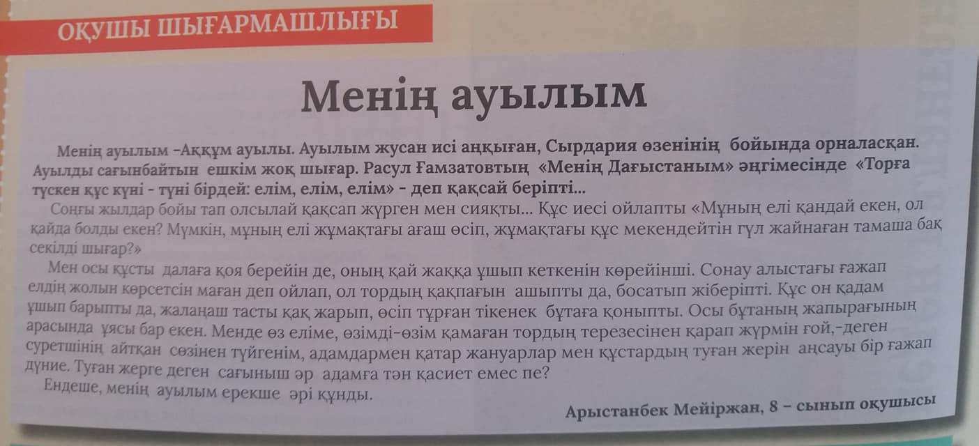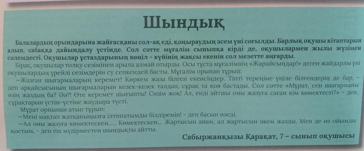 21 январь 2021 0 1 2 3 4 5 Оқушылар шығармашылығы Қызылорда облысы Жаңақорған ауданы Аққұм ауылы #221 негізгі орта мектебіндегі жас ұландардың шығармашылықтары зерек жасөспірімдерге арналған Республикалық " Farabi shakirti " журналына жарыққа шықты.