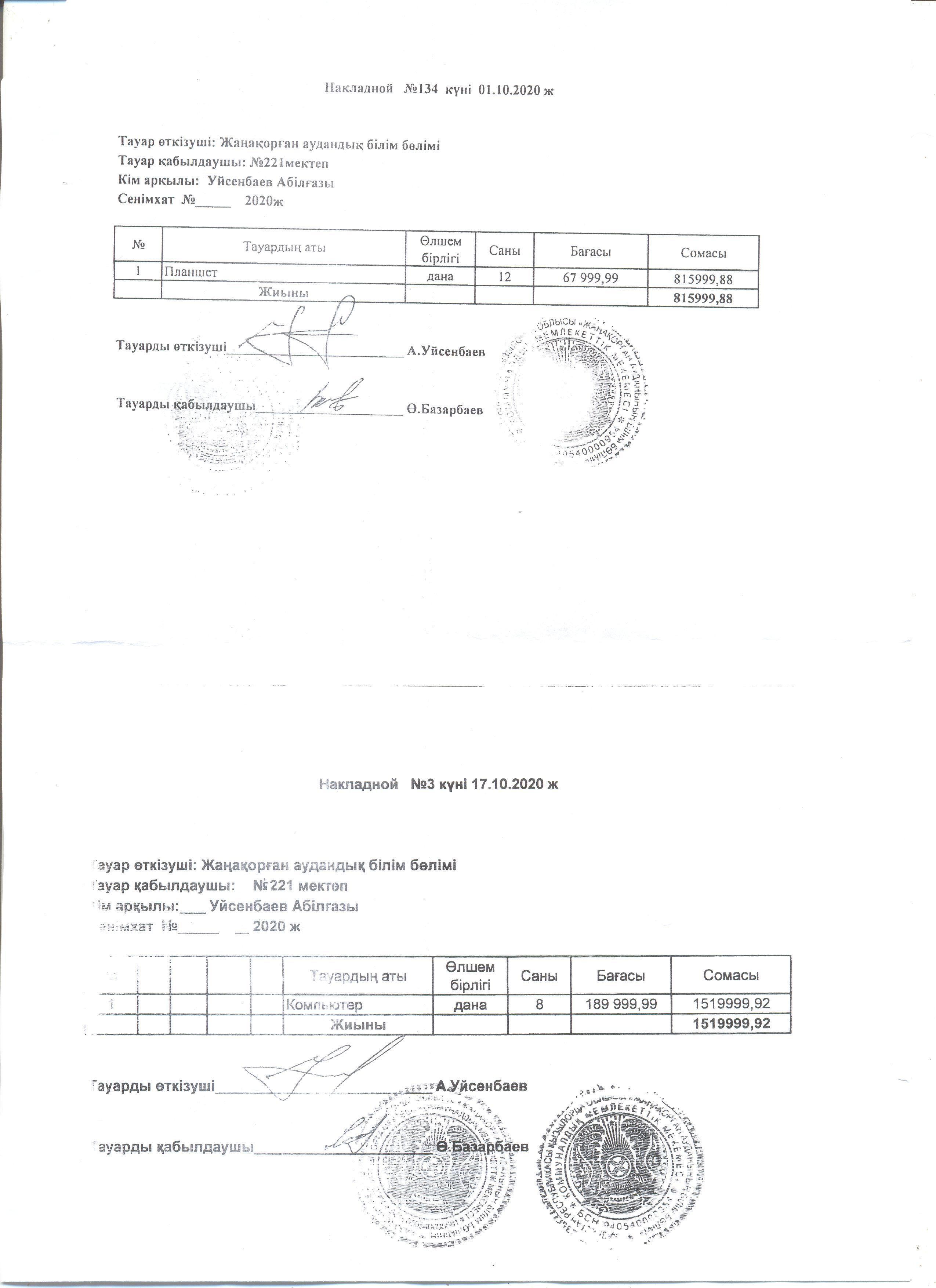 2020-2021 оқу жылында әлеуметтік тұрмысы төмен, көп балалы отбасы балаларына компьютер, ноутбук, планшеттерді тарату туралы №221 негізгі орта мектебінде 5 қыркүйек 2020 жылы ата-аналар жиналысы болып өтті. Жиналыста елдегі белең алған пандемия жағдайына байланысты елімізде көптеген мектептер қашықтан оқитындығы жөнінде айта келіп, біздің мектебіміздегі бала саны аздығына байланысты мектепте дәстүрлі оқитындығы жайлы хабарлама жасалды. Қазіргі таңда мектепке 58 отбасынан 119 бала білім алатынын, оның ішінде 30 көп балалы отбасынан 77 бала, 3 толық емес отбасынан 5 бала, аз қамтылған тұрмысы төмен отбасынан 4 бала білім алатындығы жөнінде айтылып, отбасыларға мемлекет тарапынан бөлініп отырған ноутбук, компьютер, планшеттердің келіп тұрғанын, мектеп онлайн оқуға көшкен жағдайда осы аталған техникалық құрылғылардың берілетіндігі жайлы ата-аналарға ескертті.