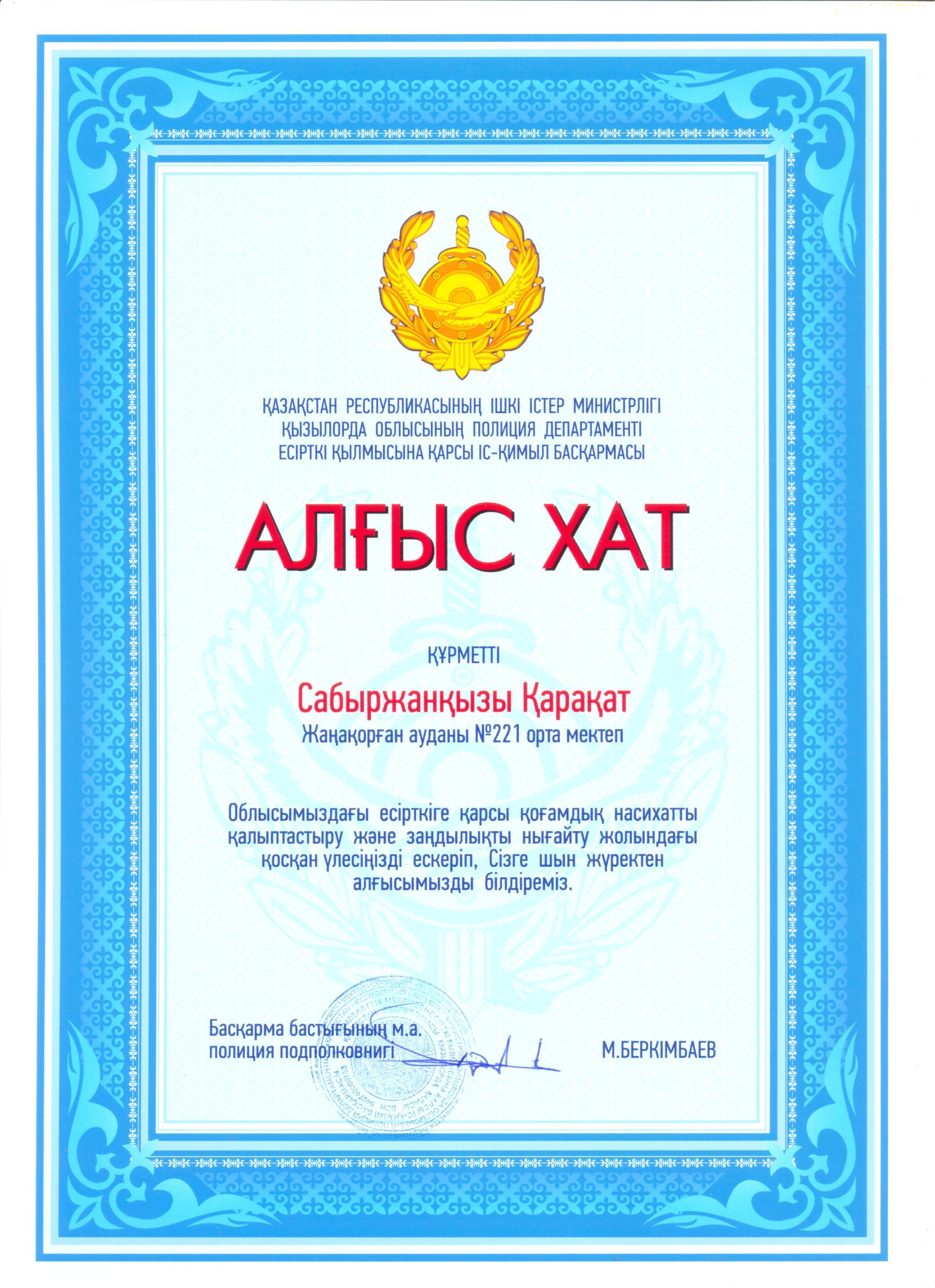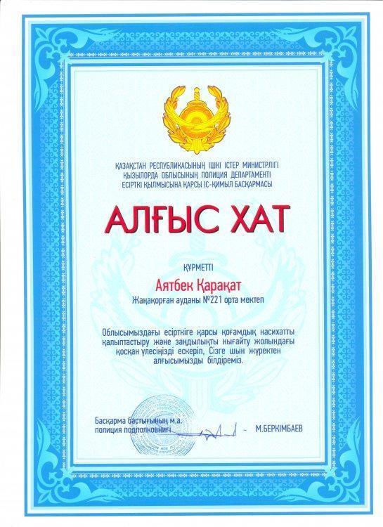 20 қараша күні ұйымдастырылған эссе жазу байқауы бойынша облысымыздағы есірткіге қарсы қоғамдық насихатты қалыптастыру және заңдылықты нығайту жолындағы қосқан үлесі үшін №221 негізгі орта мектебінің 7-сынып оқушылары Қ.Аятбек, Қ.Сабыржанқызы Қазақстан Республикасының Ішкі Істер Министрлігі Қызылорда облысының Полиция Департаментінің есірткі қылмысына қарсы іс-қимыл басқармасының Алғыс хатымен марапатталды.
