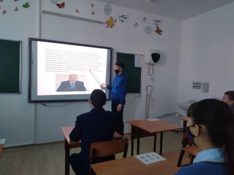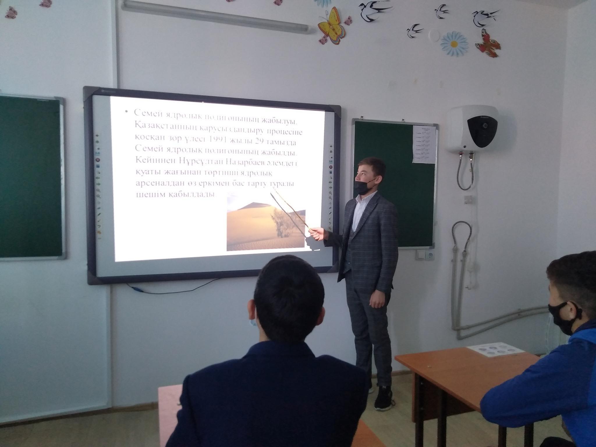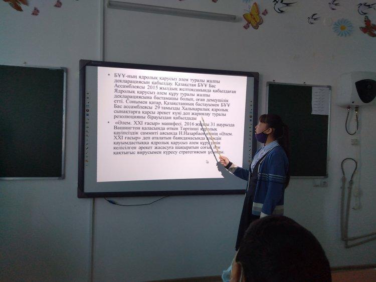 Қызылорда облысы Жаңақорған ауданы 221 негізі орта мектебінің 9-сыныбында "Қазақстанның жаһандық бастамалары. Халықаралық қауіпсіздікке үлес" тақырыбында тәрбие сағатында еліміздің ядролық қарудан бас тарту жөнінде атқарған жұмыстары туралы кеңінен баяндалды.