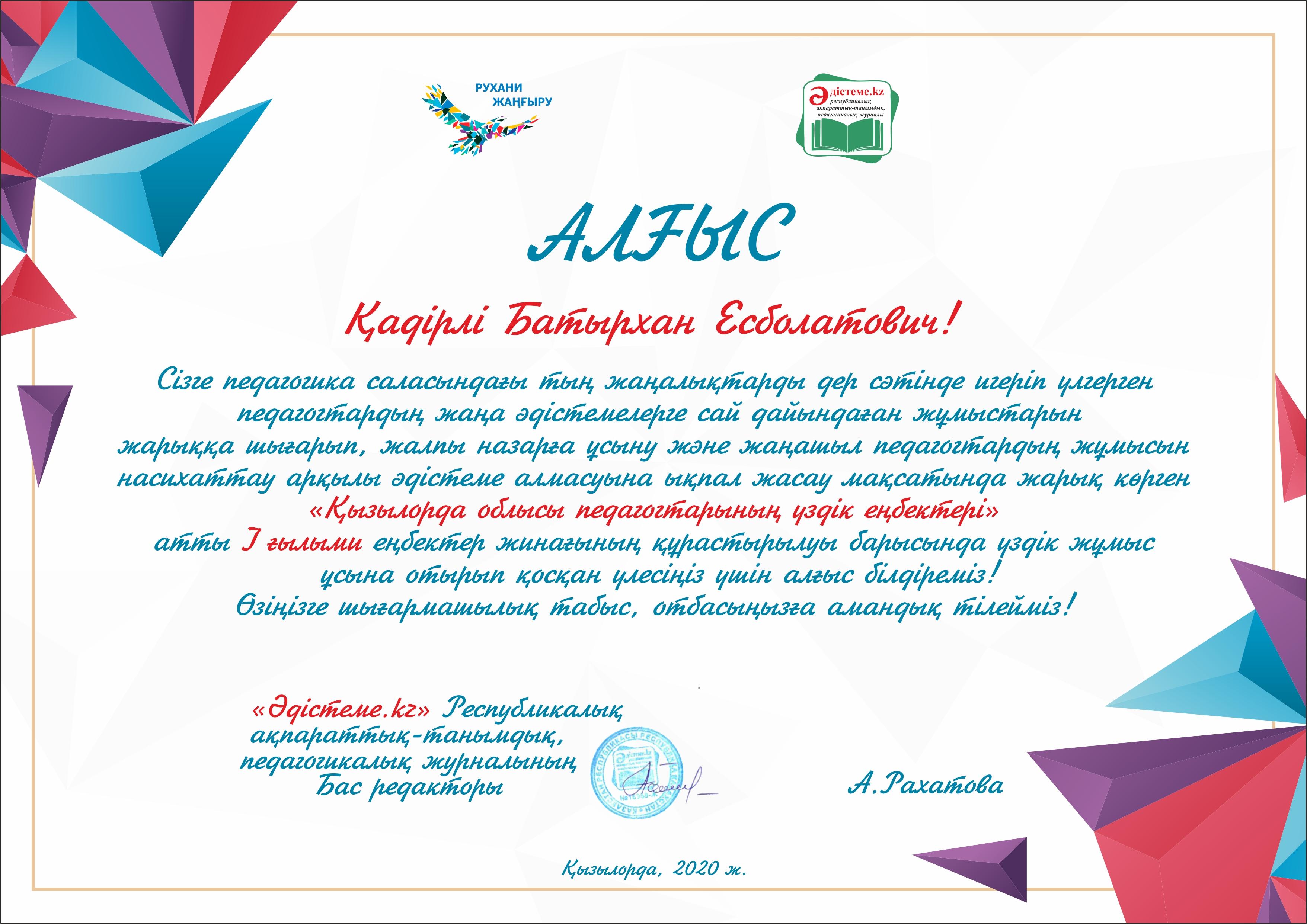 29 январь 2021 0 1 2 3 4 5 ҚЫЗЫЛОРДА ҮЗДІК ПЕДАГОГТАРЫНЫҢ ҮЗДІК ЕҢБЕКТЕРІ ҚЫЗЫЛОРДА ҮЗДІК ПЕДАГОГТАРЫНЫҢ ҮЗДІК ЕҢБЕКТЕРІ жинағына мектебіміздің барлық ұстаздарының еңбегі жарық көрді және ұстаздарымыз Алғыс хаттармен марапатталды.Ұстаздарымызды құттықтаймыз!!!