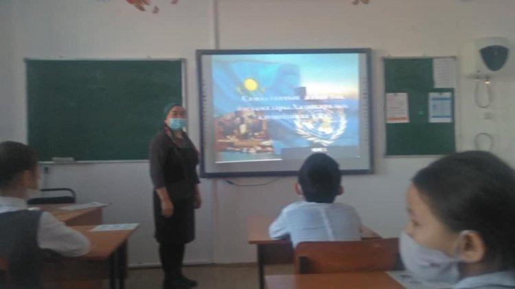 Аудандық білім бөлімінің 2021арналған облыстық қоғамдық саяси маңызды шаралардың күнтізбелік жоспарына сай #221негізгі орта мектебінің 3-сынып жетекшісі Ж. Каимованың ұйымдастыруымен «Қазақстанның жаһандық бастамалары. Халықаралық қауіпсіздікке үлес» тақырыбында сынып сағаты болып өтті.