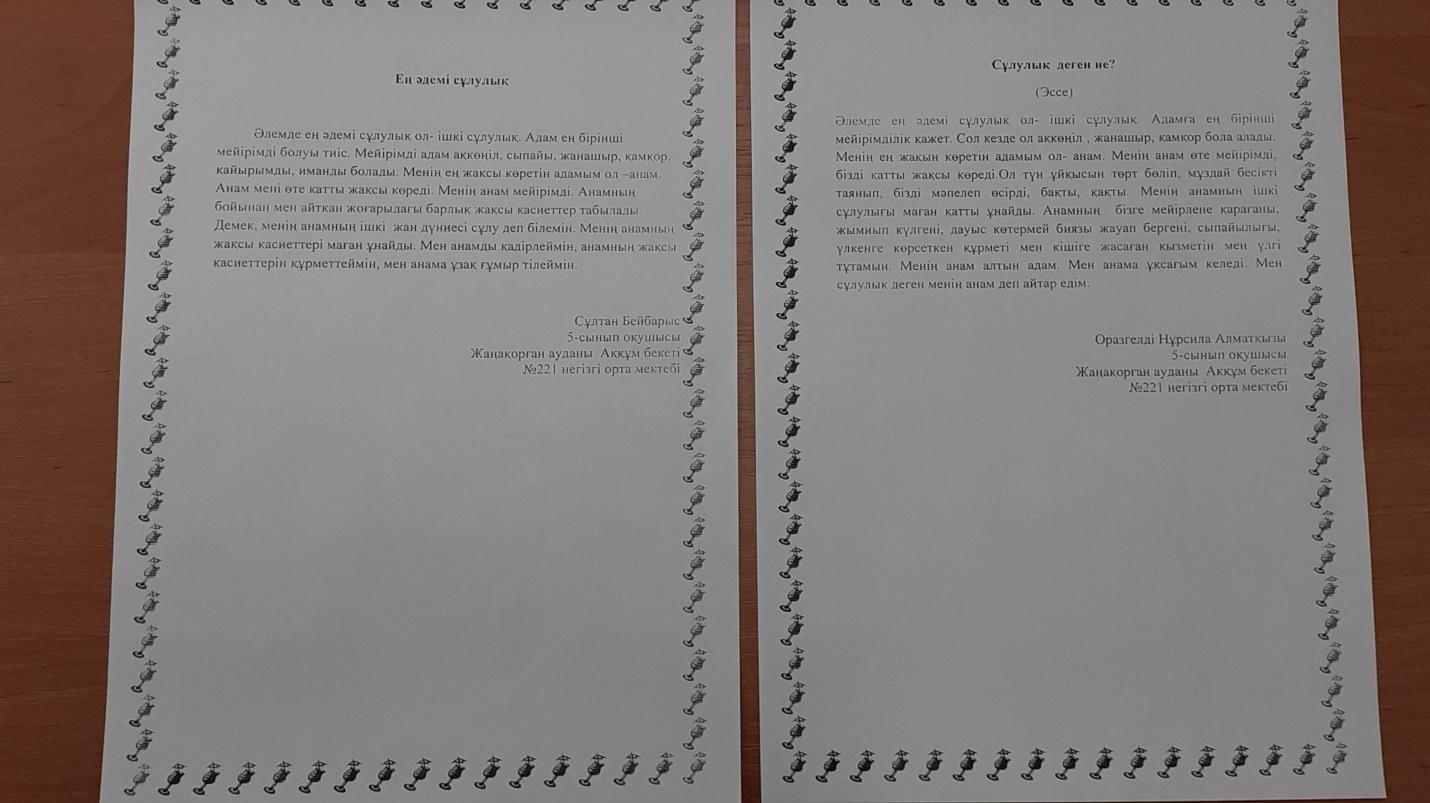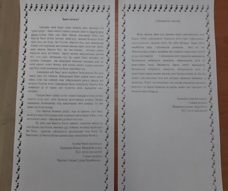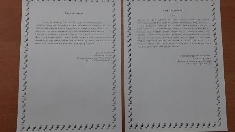 №221 негізгі орта мектебінде 5.02.2021 жылы 5-9-сынып оқушылары арасында «Өзін-өзі тану –сүйіспеншілік пен шығармашылық педагогикасы» онкүндігіне орай «Жалпыадамзаттық құндылықтар- менің ұстанымым» тақырыбында шығармашылық күні болып өтті. Оқушылар жалпыадамзаттық құндылығына толы шығармашылық эсселерімен бөлісті. Оқушылар өздері жазған эсселерінде құндылықтар мен қсаиеттер туралы ойларын ортаға салып, ерекше көзге түсті. Оқушылар бойларындағы жақсы қасиеттерін көрсете білді. Өзін-өзі тану пән мұғалімі Сейтова Гүлзада 5-сынып, 9-сынып оқушыларына белсене қатысқаны үшін алғысын білдірді.