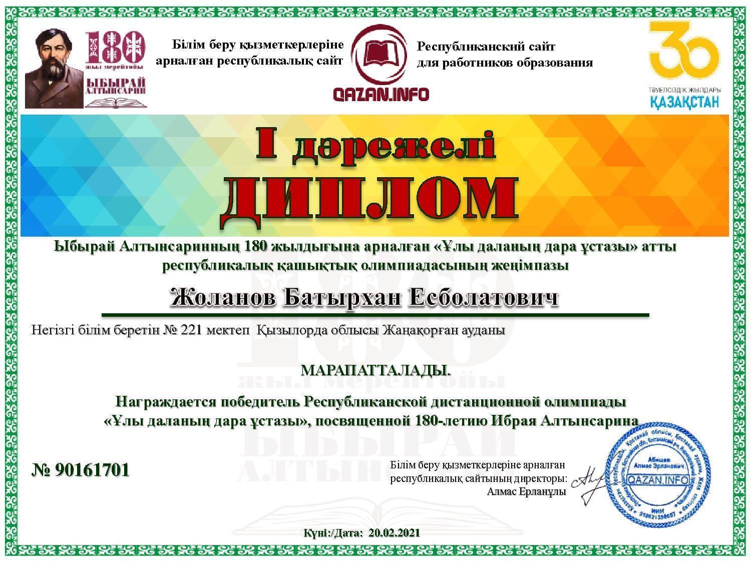 23 февраль 2021 0 1 2 3 4 5 "Ұлы даланың дара ұстазы" атты республикалық қашықтық олимпиадасының жеңімпазы Ыбырай Алтынсаринның 180 жылдығына арналған "Ұлы даланың дара ұстазы" атты республикалық қашықтық олимпиадасының жеңімпазы Жоланов Б.Е І дәрежелі дипломға ие болды.