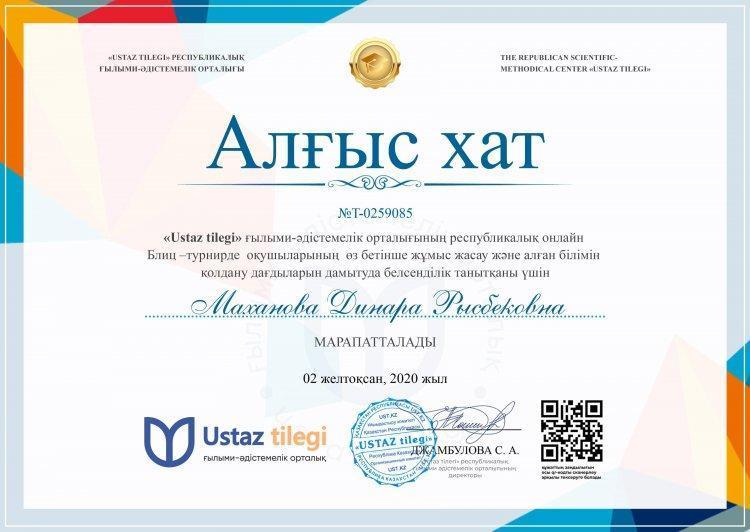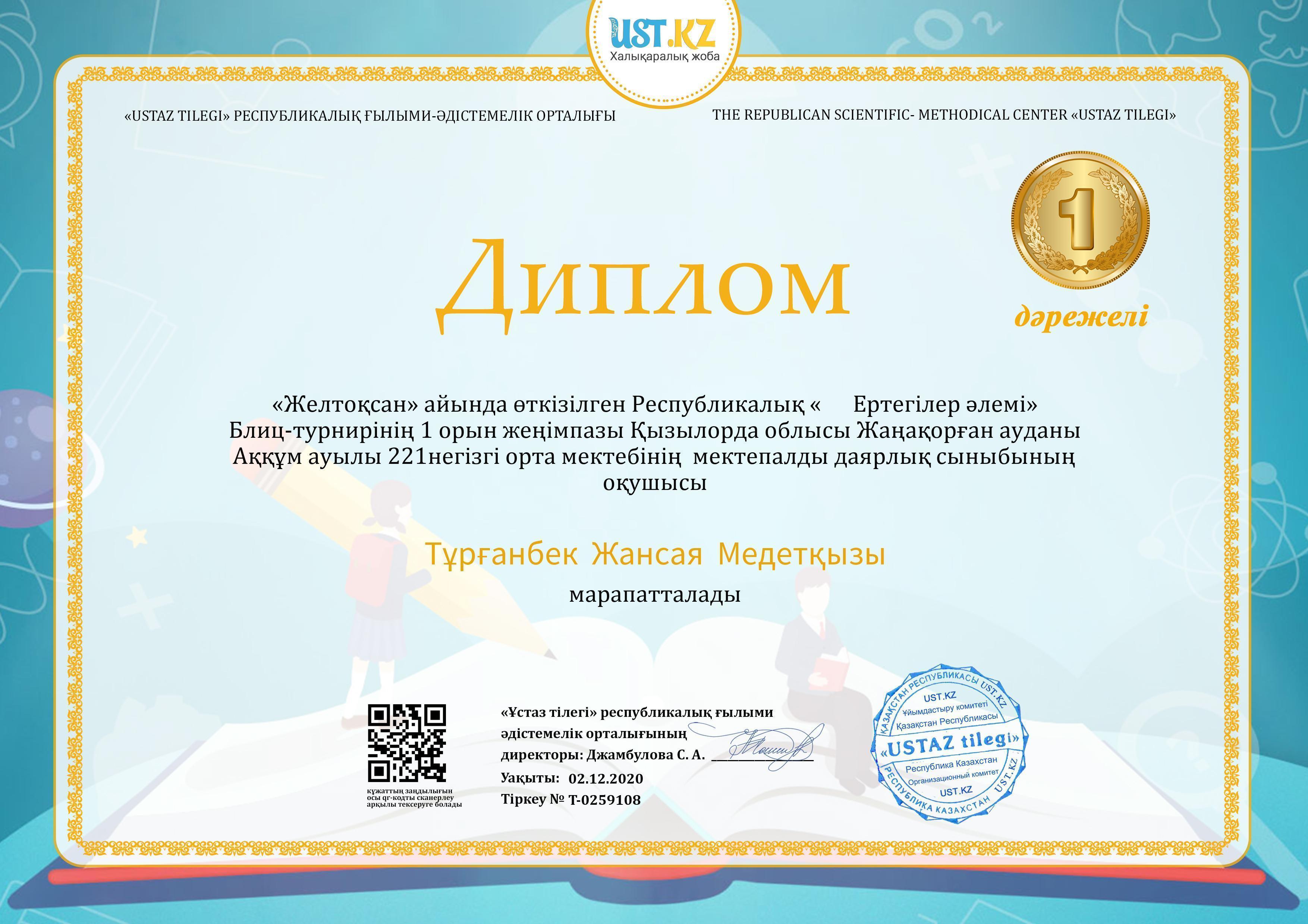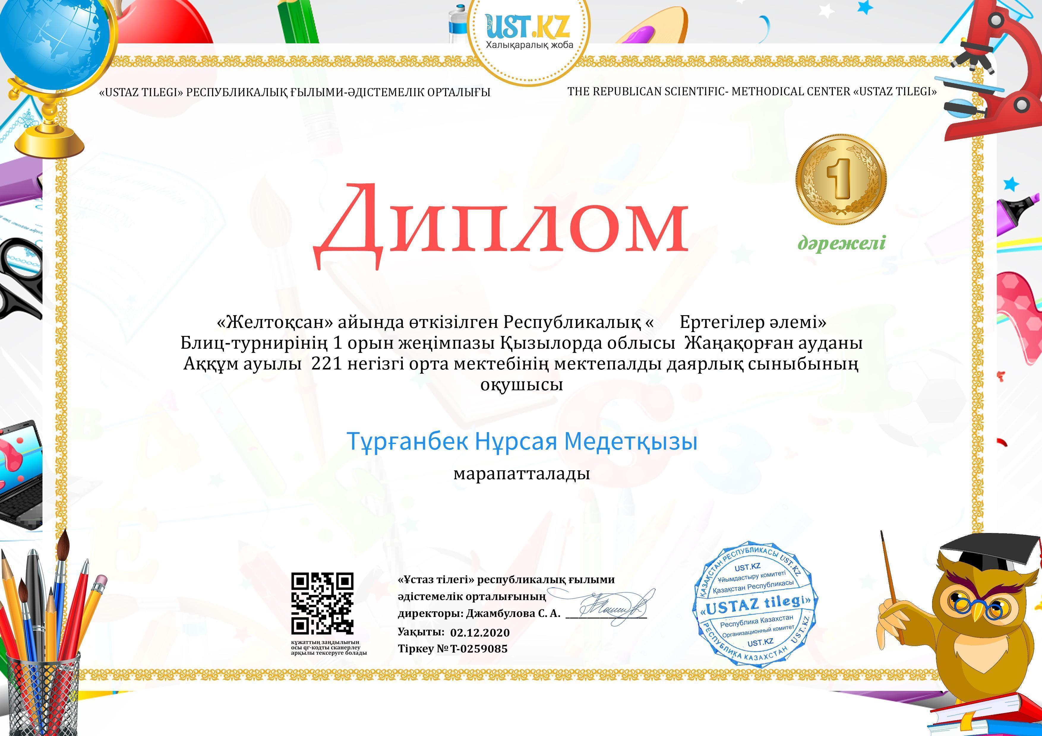 02 апрель 2021 0 1 2 3 4 5 "Ертегілер әлемінде" блиц-турнирінің жеңімпаздары Желтоқсан айында өткізілген республикалық "Ертегілер әлемінде" блиц-турниріне мектепалды даярлық тобының оқушылары қатысып, жүлделі орындарға ие болды. Жүлдегерлерді дайындағаны үшін жетекшісі Д.Маханова марапатталды. Жеңімпаздарды құттықтаймыз!!!