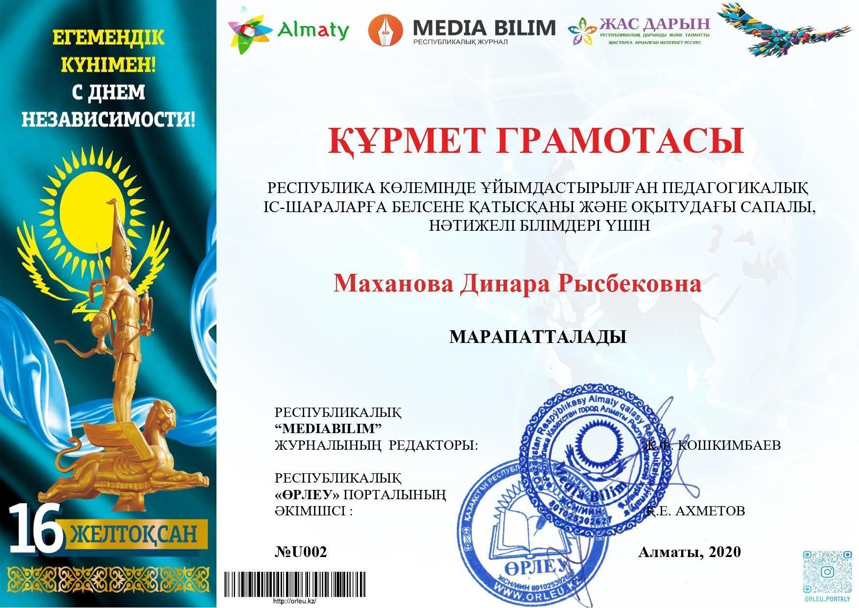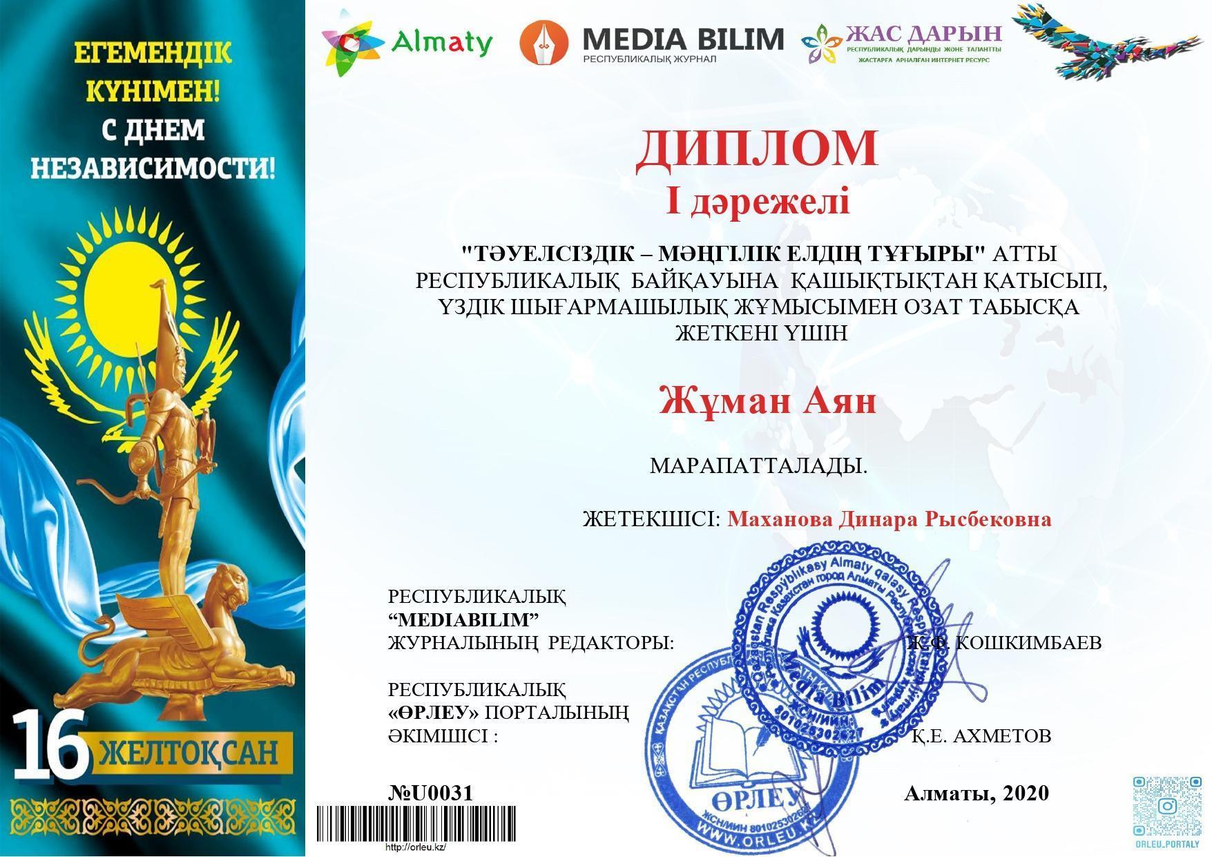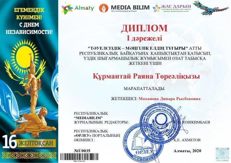 Республикалық "Өрлеу" порталы ұйымдастырған "Тәуелсіздік - мәңгілік елдің тұғыры" республикалық шығармашылық байқауын қатысқан мектепалды даярлық тобының оқушылары жүлделі жетістіктерге жетіп, арнайы дипломадрмен марапатталды. Топтың жетекшісі Д.Маханова арнайы құрмет грамотасына ие болды.