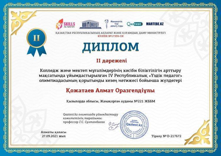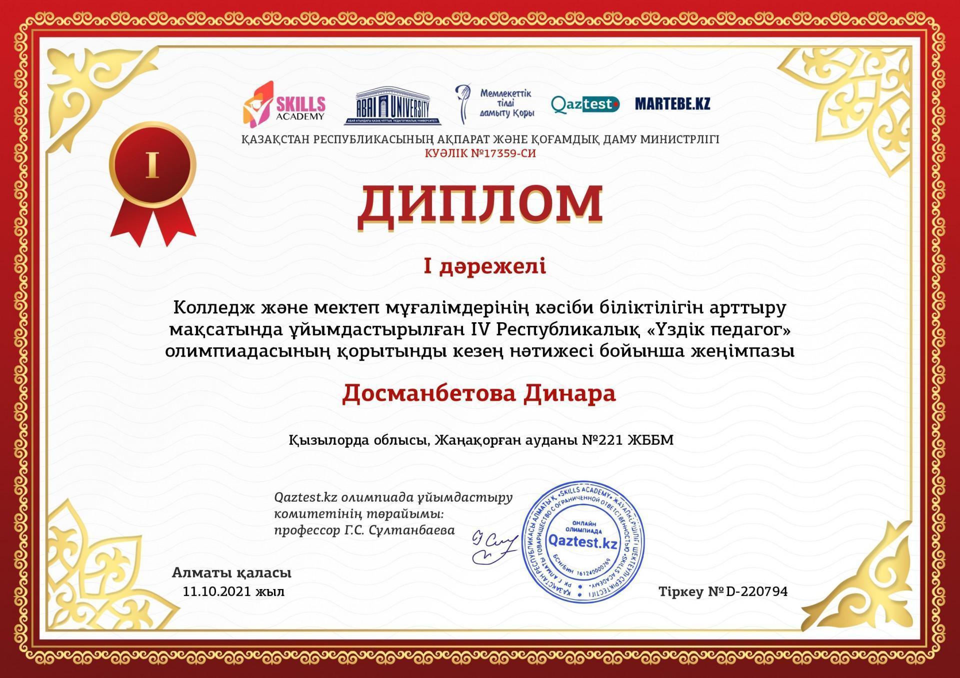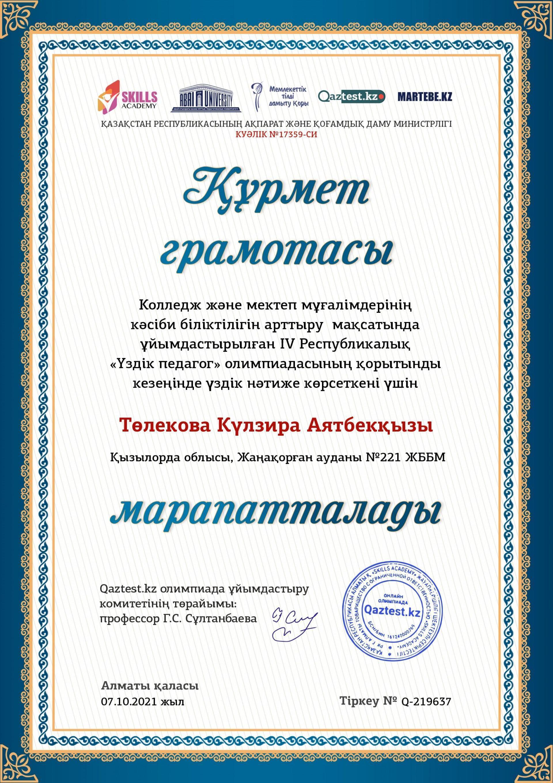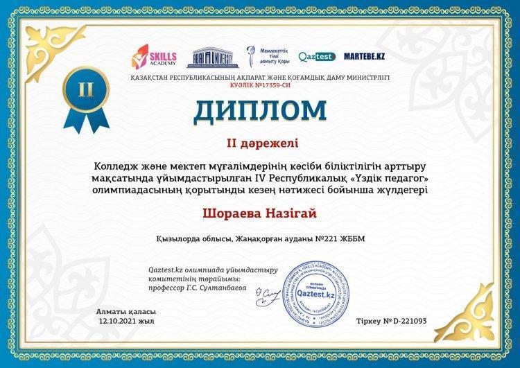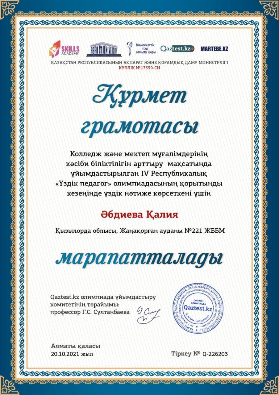 Колледж және мектеп мұғалімдерінің кәсіби біліктілігін арттыру мақсатында ұйымдастырылған ІҮ Республикалық "Үздік педагог" олимпиадасына қатысып жүлделі болған №221 негізгі орта мектебінің мұғалімдерін құттықтаймыз.
