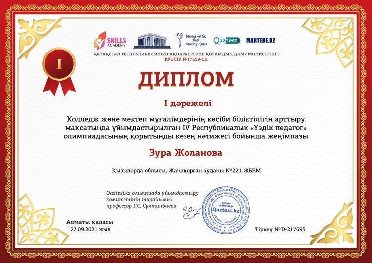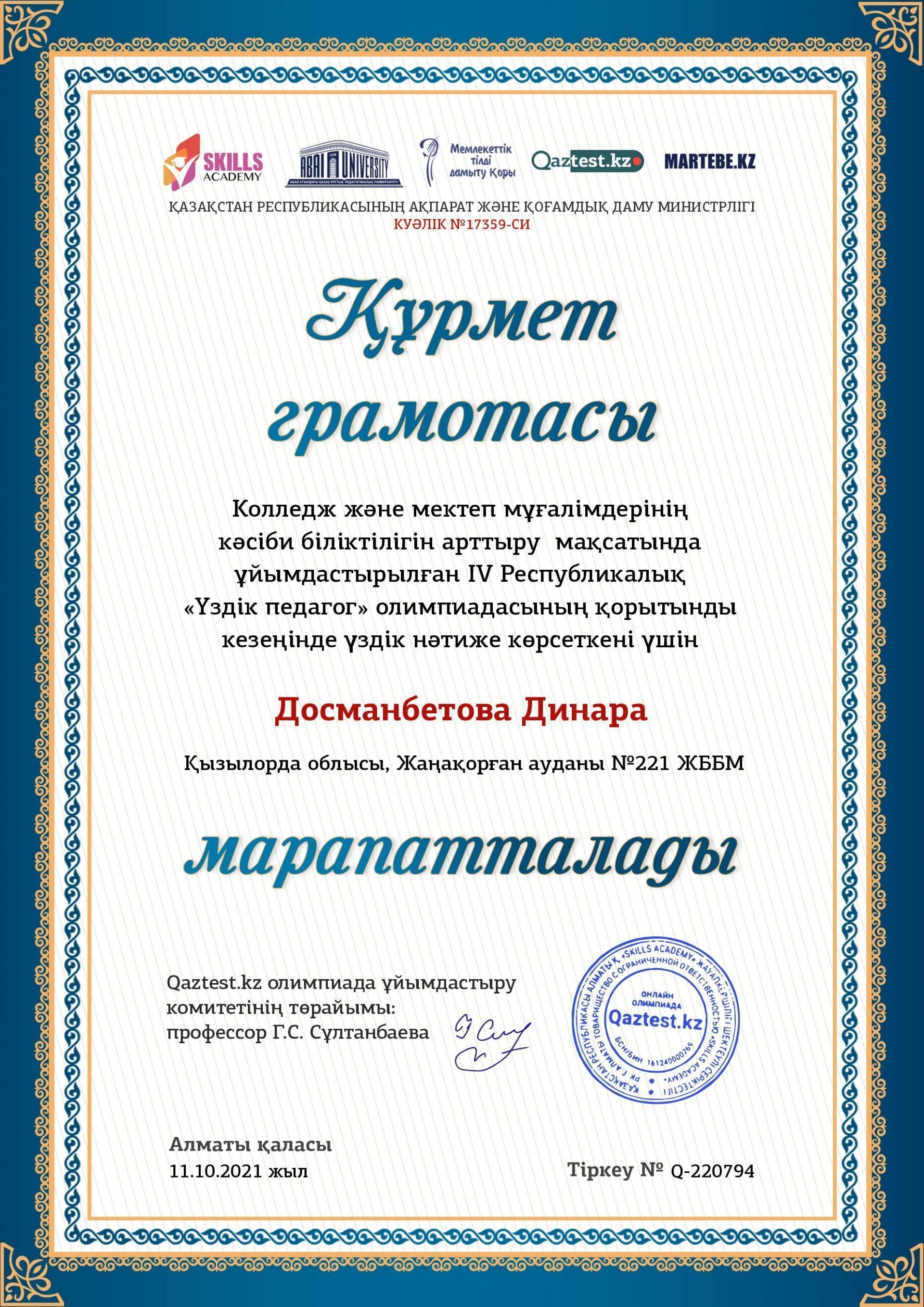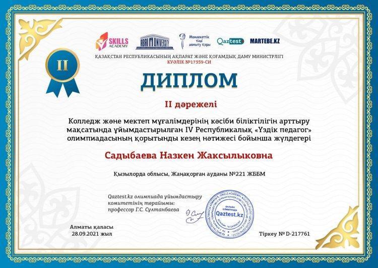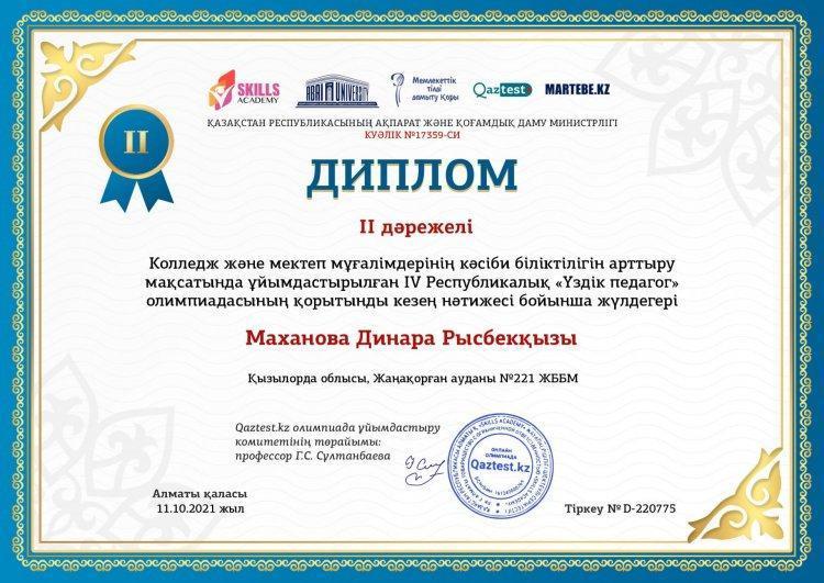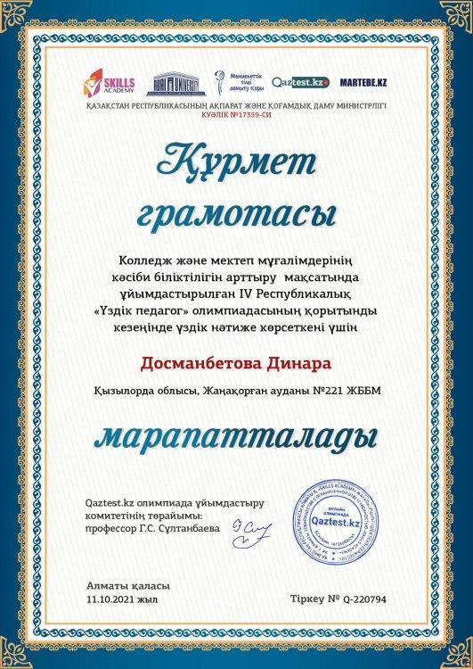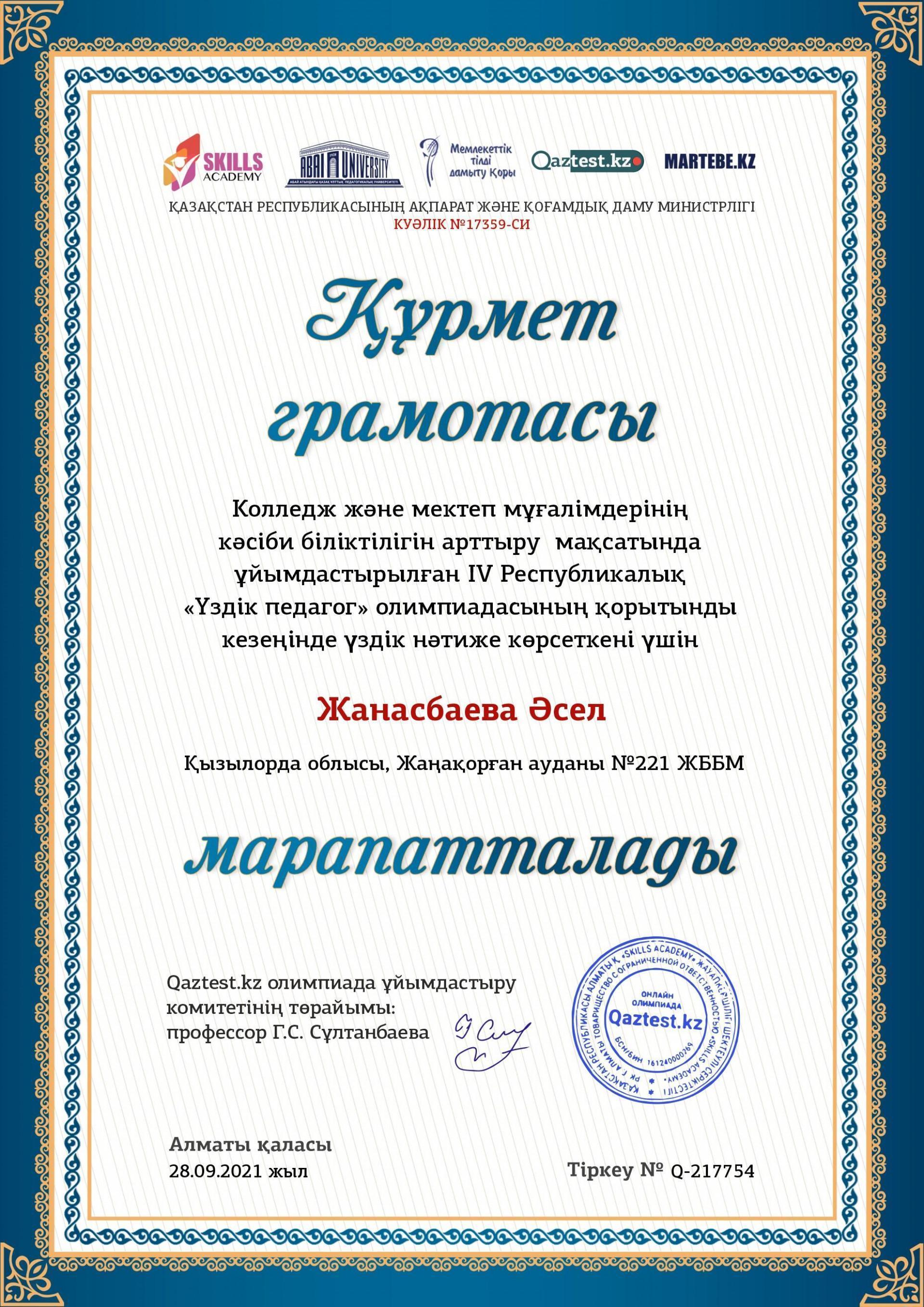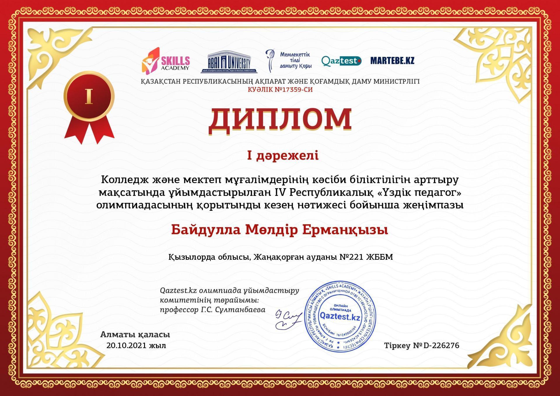 Колледж және мектеп мұғалімдерінің кәсіби біліктілігін арттыру мақсатында ұйымдастырылған ІҮ Республикалық "Үздік педагог" олимпиадасына қатысып жүлделі болған №221 негізгі орта мектебінің мұғалімдерін құттықтаймыз.