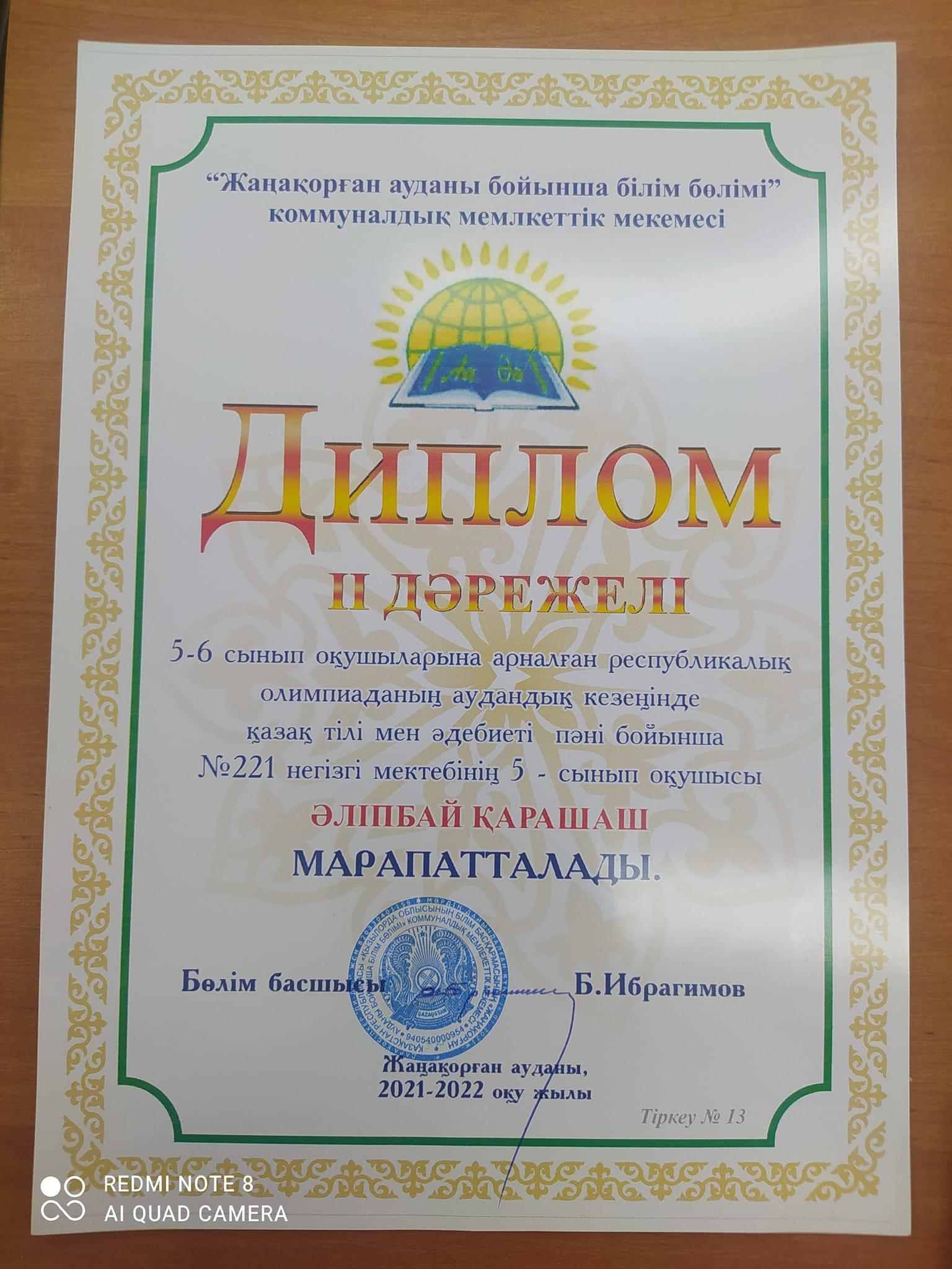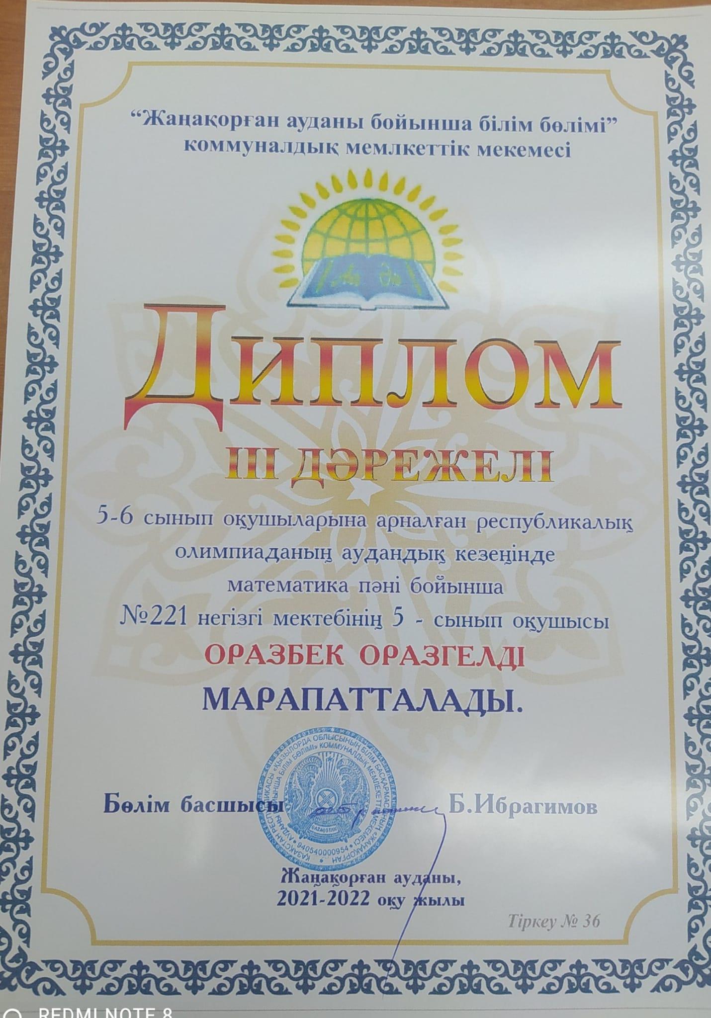 5-6 сынып оқушыларына арналған республикалық олимпиаданың аудандық кезеңінде №221негізгі орта мектебінің 5-сынып оқушысы Оразбек Оразгелді математика пәні бойынша ІІІ орын иеленді. Пән мұғалімі: Н.Шораева. Қазақ тілі мен әдебиеті пәні бойынша