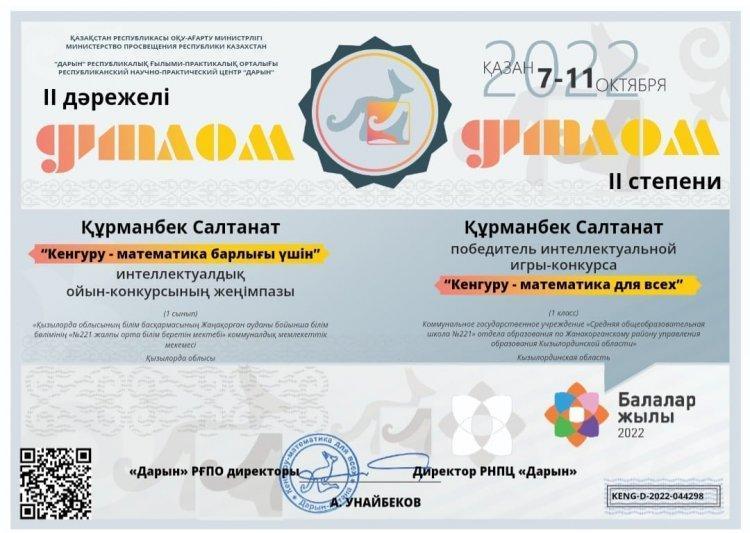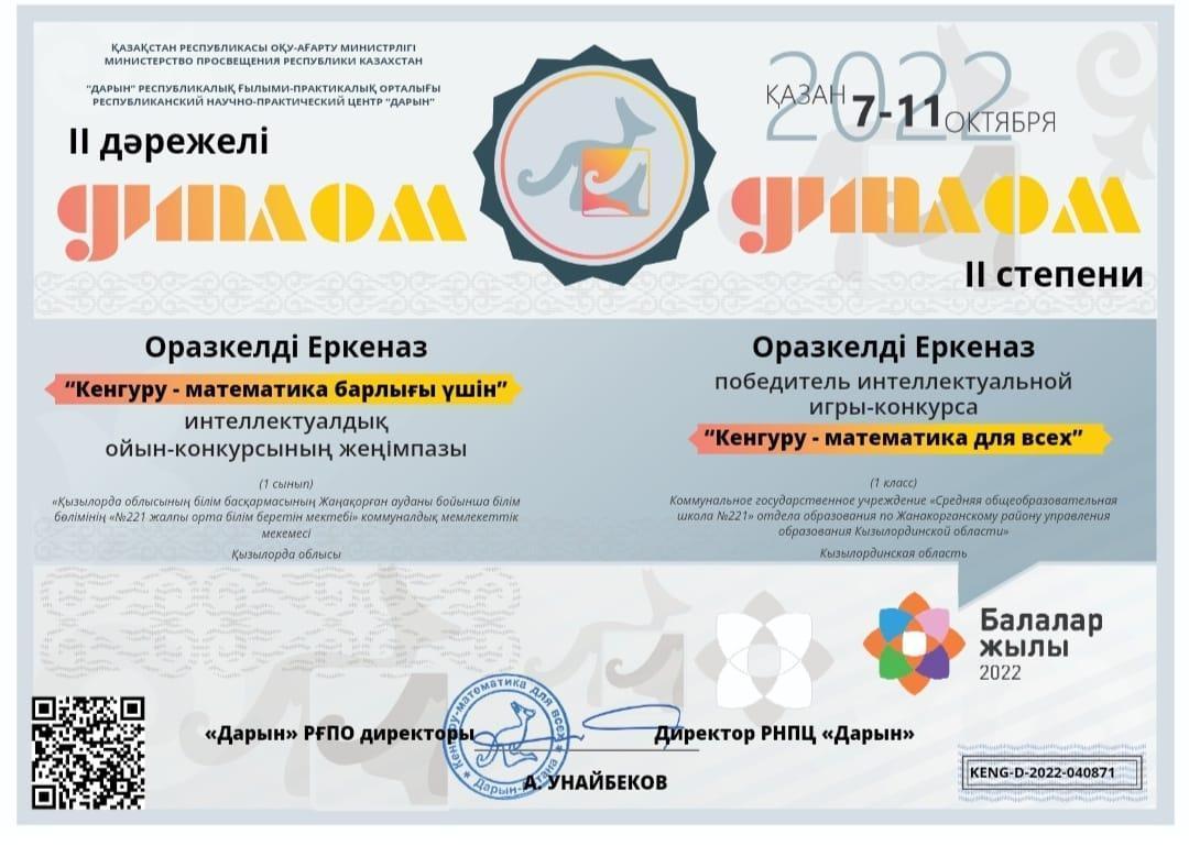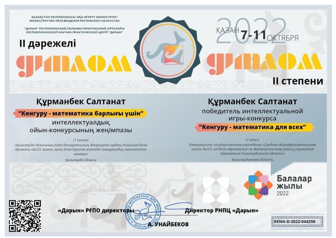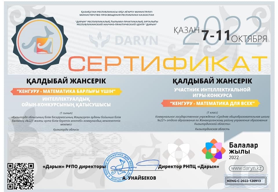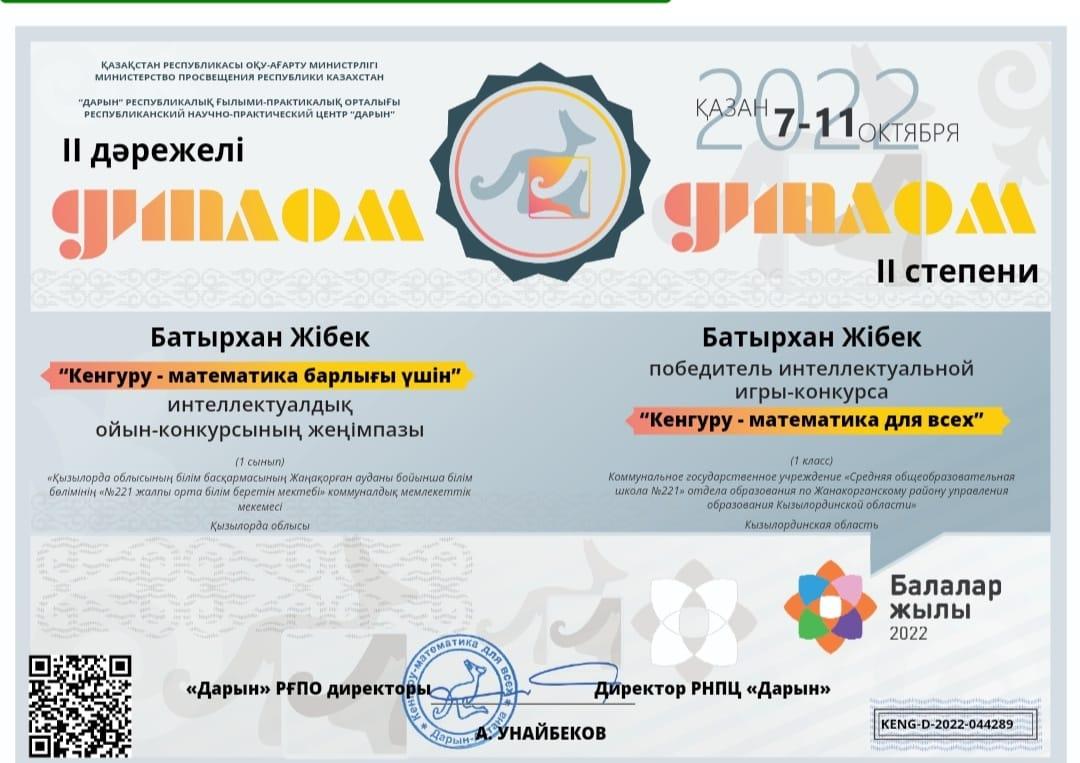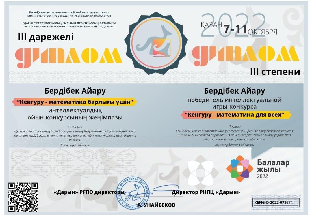 №221 жалпы орта білім беретін мектебінің 1-сынып оқушылары Батырхан Жібек, Оразкелді Еркеназ, Құрманбек Салтанат, Бердібек Айару, Қалдыбай Жансерік "Кенгуру- математика барлығы үшін" интеллектуалды ойын- конкурсының ІІ-ІІІ дәрежелі дипломдарына ие болды.