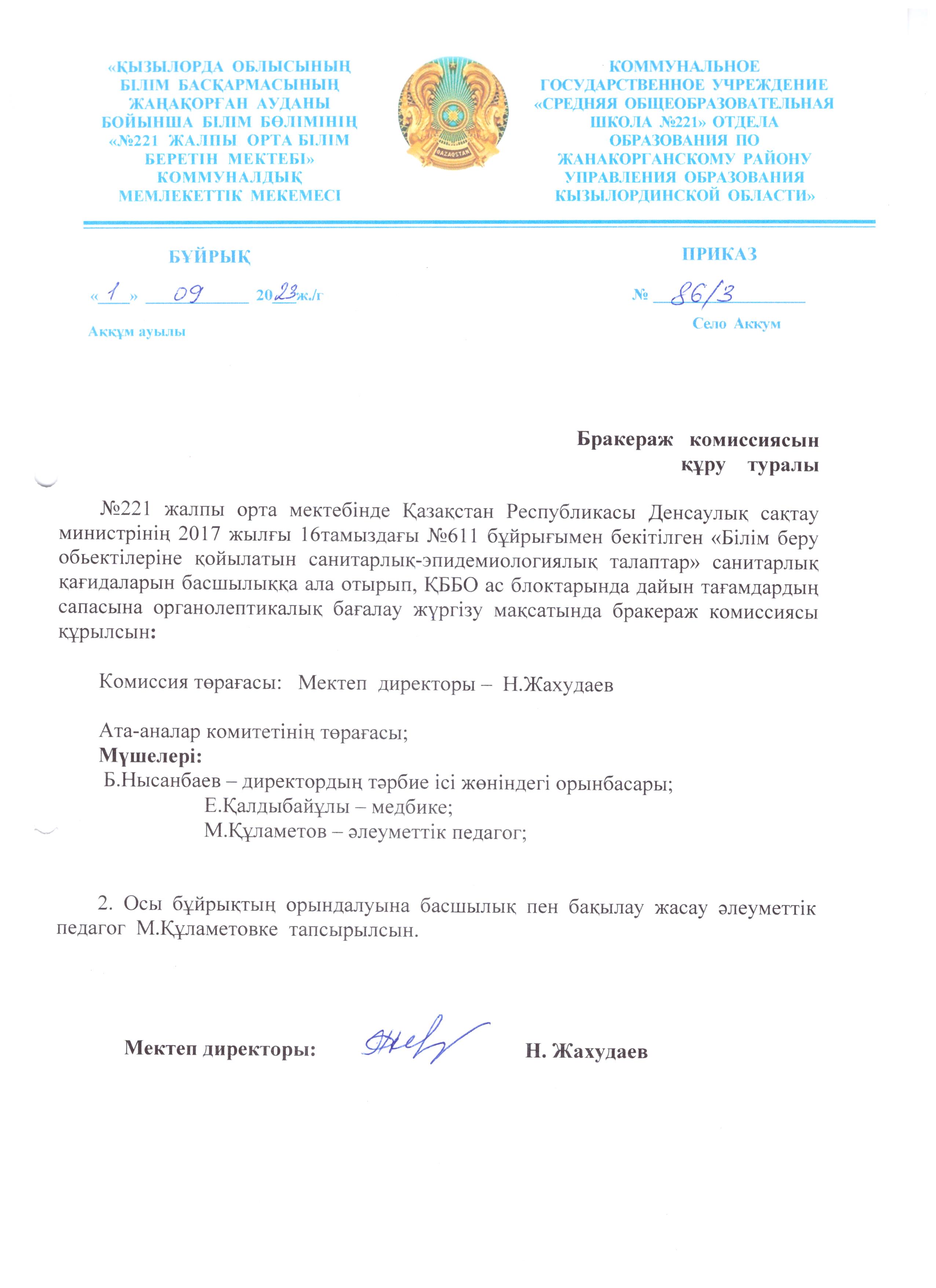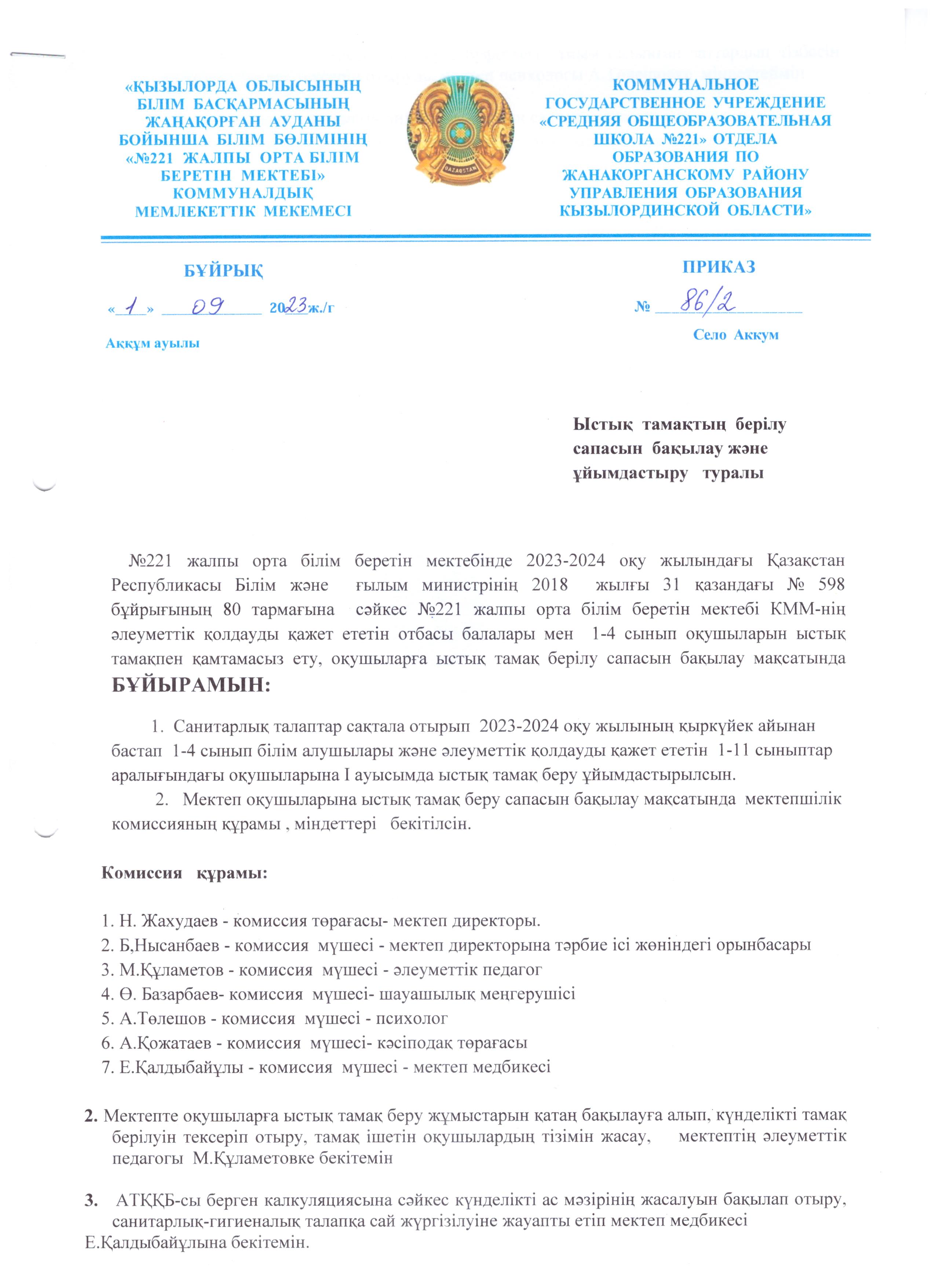 Мектепте тамақтандыруды бақылау комиссиясын құру туралы » №221 орта мектебі