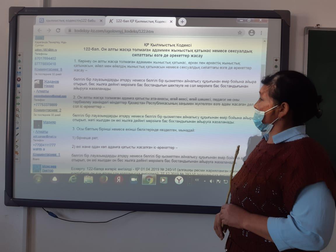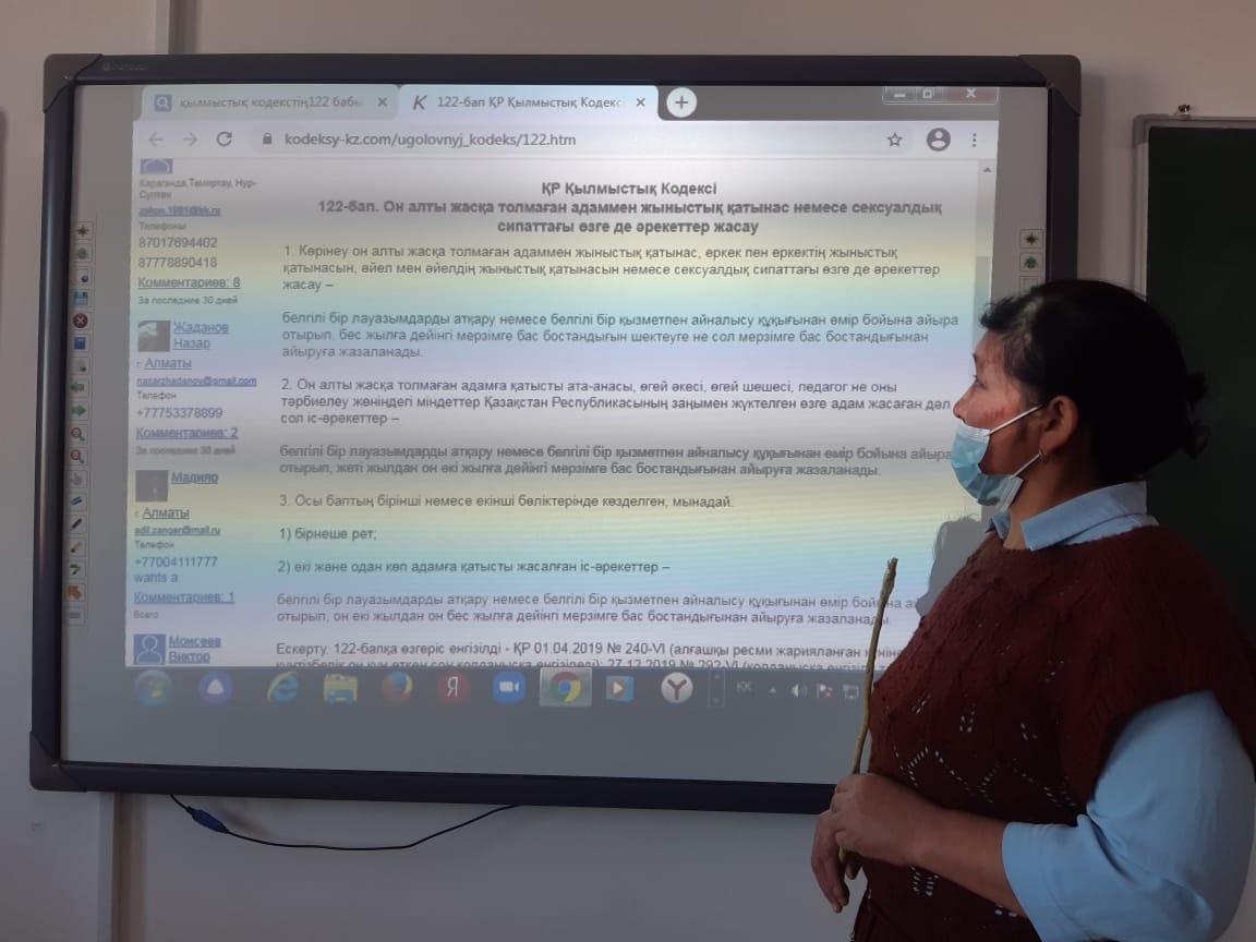 Мектебіміздің 7-сыныбында сынып жетекшісі М.Бердіқожаева қыздар жиналасының барысында ерте жүктіліктің алдын алу мақсатында түсіндірме жұмыстарын жүргізді. Қылмыстық кодекстің 122-бабы туралы түсінік берді. сонымен бірге ерте жүктілік жайлы оқушылардыңда ой-пікірлері тыңдалды.
