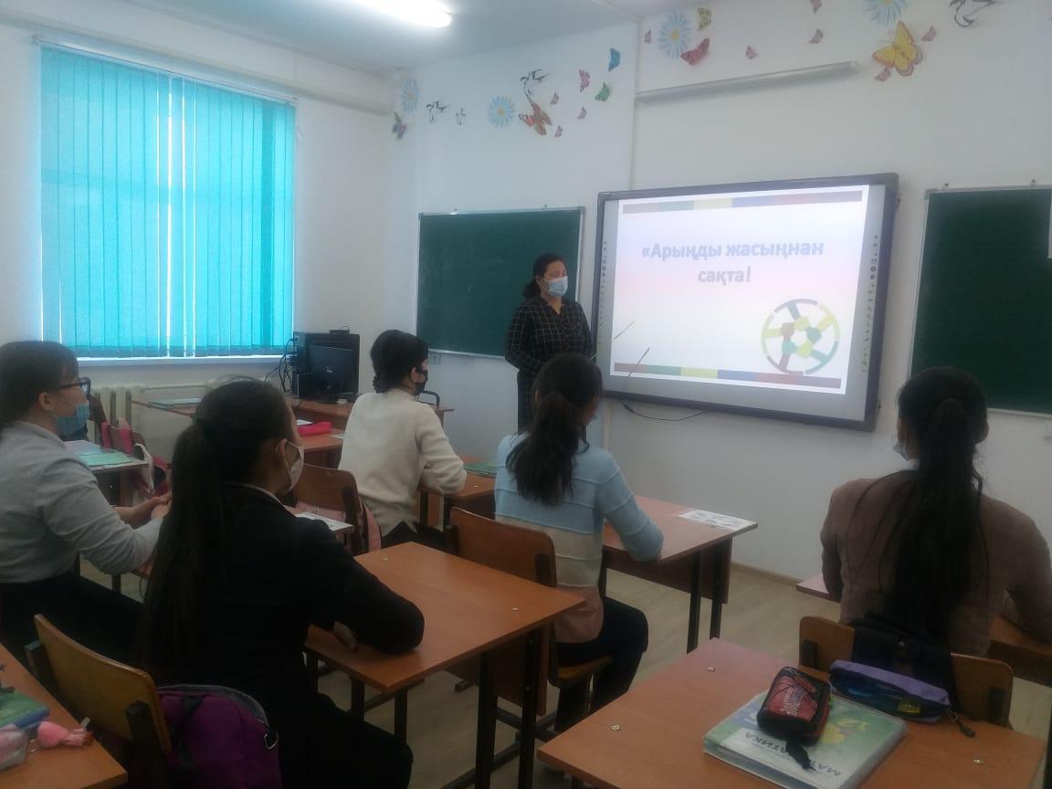 Жаңақорған ауданы Аққұм ауылындағы №221негізгі орта мектебінде кәмелеттік жасқа толмаған 8-сынып оқушыларымен сынып жетекшісі А.Айтөреева «Арыңды жасыңнан сақта!» тақырыбында ерте жүктіліктің алдын алуға байланысты түсіндірме жұмыстарын жүргізіп, қылмыстық кодекстің 122 бабы жайлы жан-жақты ақпарат берді.