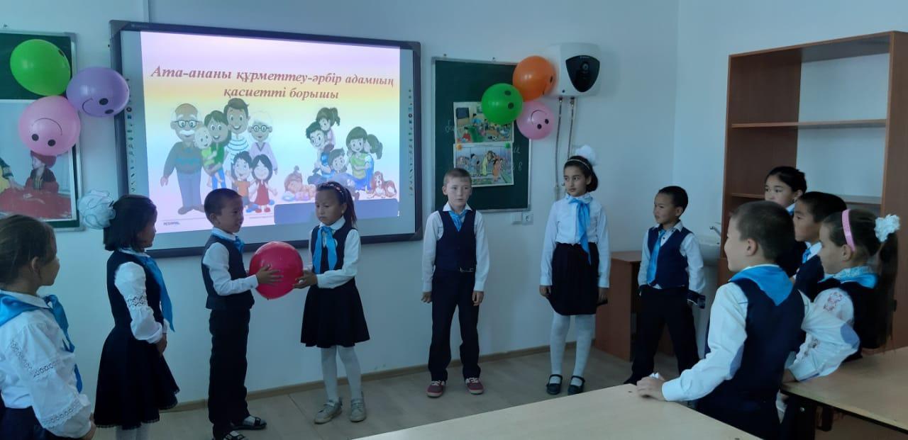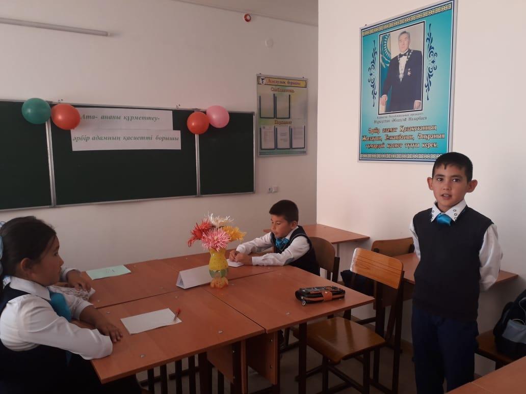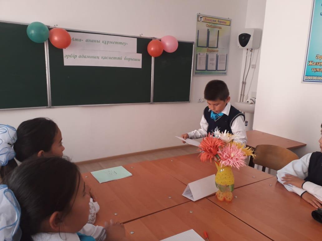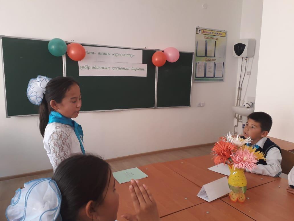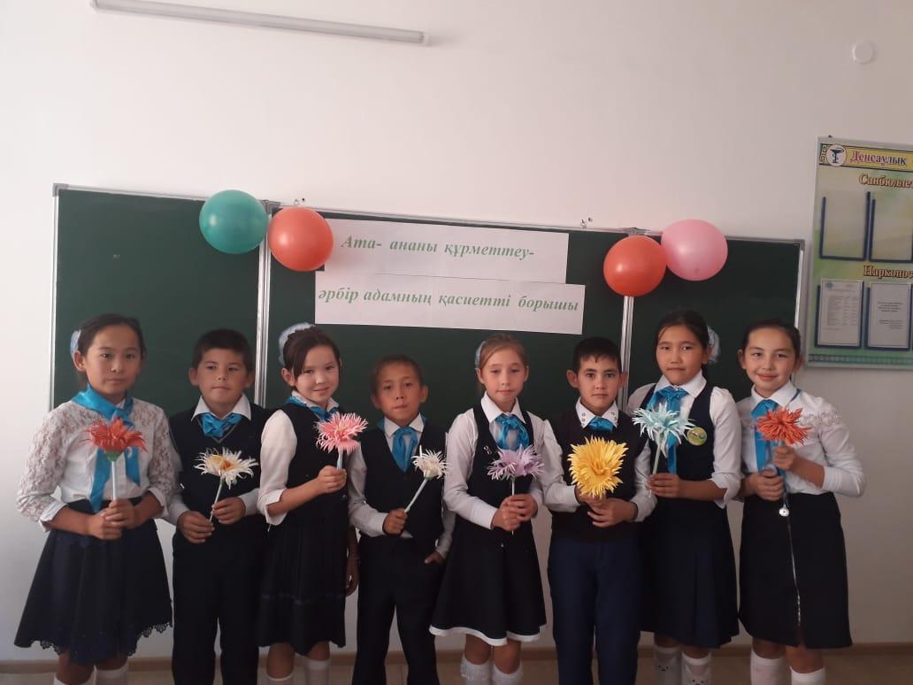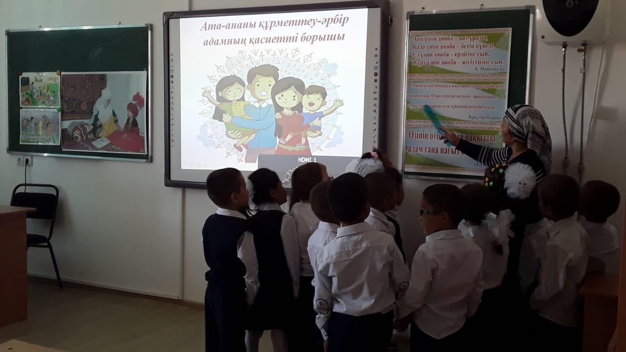 2019 жылдың 13 қыркүйегі күні барлық сыныптарда аудандық білім бөлімінің қатынасына сәйкес, «Ата-ананы құрметтеу – әрбір адамның қасиетті борышы» тақырыбында тәрбие сағаты болып өтті. Оқушылардың отбасы, жанұя туралы білімдерін шыңдай түсу, отбасы құндылықтарының маңызын дәріптеу,отбасын, отбасы мүшелерін құрметтеуге, сыйлауға тәрбиелеу мақсатында ұйымдастырылған іс–шараларға сынып оқушылары белсене қатысты. Тәрбие отбасынан басталады. Отбасының тірегі әлпештеген әке мен аялаған ана екендігі баса айтылды.
