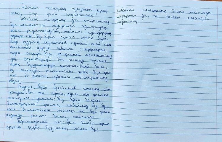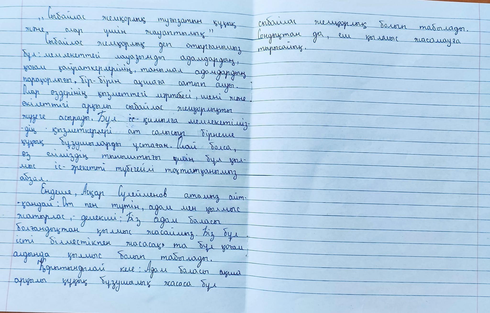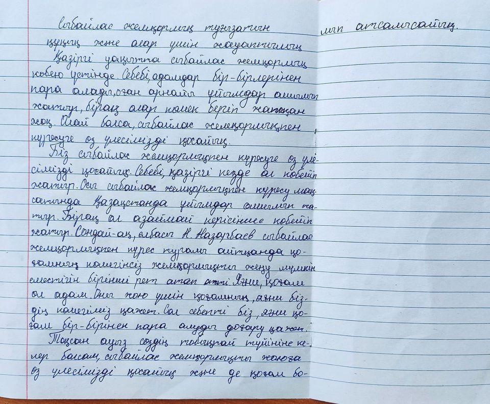 №221 негізі орта мектебінде « Адал ұрпақ» ерікті клуб жоспарына сәйкес ақпан айында 7—9 сыныптар арасында « Сыбайлас жемқорлық туғызатын құқық және олар үшін жауаптылық» тақырыбында эссе байқауы болды. Байқауда жеңіс жеткен оқушылар: 8 — сынып оқушысы Аятбек Қарақат, 7 — сынып оқушылары Саламатқызы Кәусар, Үсенбек Рамина, Бегалы Інжу.