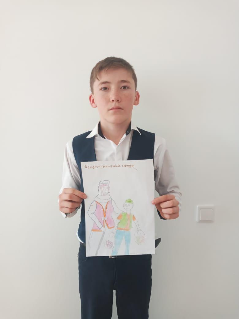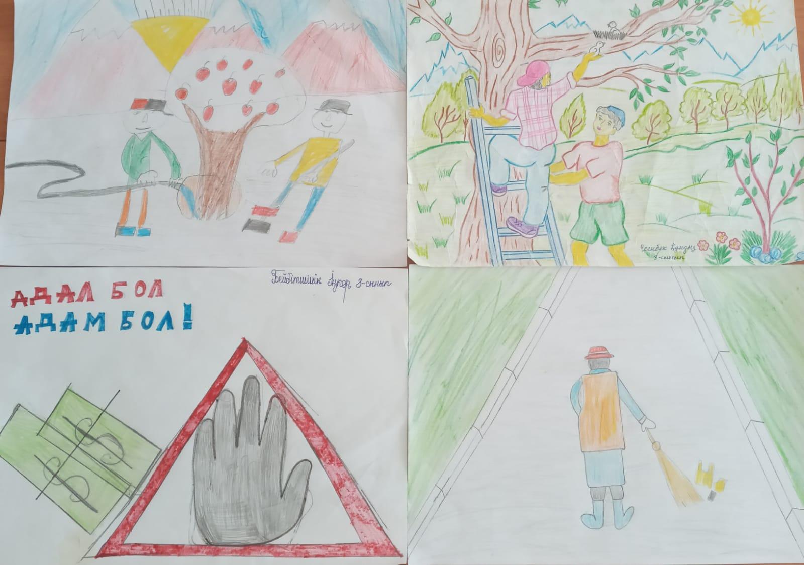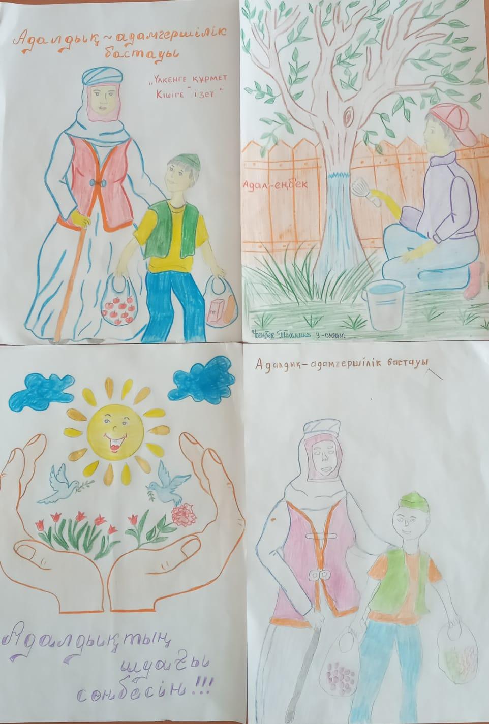 13 ақпан күні "Адалдық-ардың ісі" тақырыбындағы танымдық апталық жоспарына сәйкес 3-8 сыныптар арасында "Адалдықты сүйеміз,адал өмір сүреміз!" тақырыбында сурет байқауы өткізілді. Байқау қорытындысы бойынша І орынды 3-сынып оқушысы Үсенбек Құндыз, ІІ орынды 3-сынып оқушысы Үсенбек Тахмина , ІІІ орын 5-сынып оқушысы Үсенбек Мұстафа иеленді.