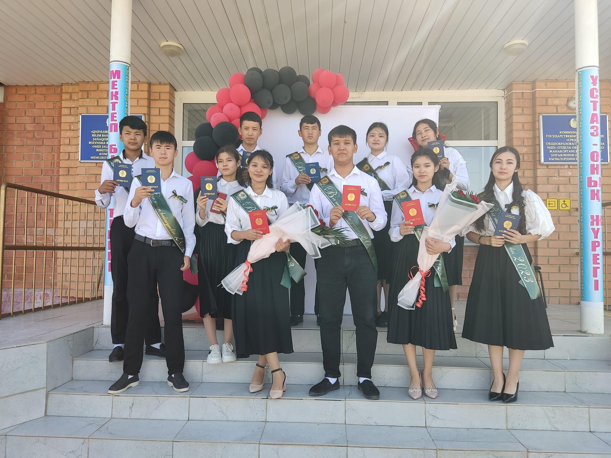 2022 - 2023 оқу жылындағы 9 сынып оқушыларына негізгі мектепті бітіргендігі туралы куәлікті тапсыру. Оқу жылын «Ерекше куәлікпен» аяқтап отырған оқушыларды марапаттау мақсатында №221 жалпы орта білім беретін мектебінде 21 маусым күні 9 сынып оқушыларына аттестат тапсыру кеші болды. Кеште мектеп директоры Н. Жахудаев, оқу ісінің орынбасары Б. Жоланов, бейінді оқыту жөніндегі орынбасары Б. Нысанбаевтар 9 сынып оқушыларына сәт сапар тілеп, құттықтау сөздерін айтты.