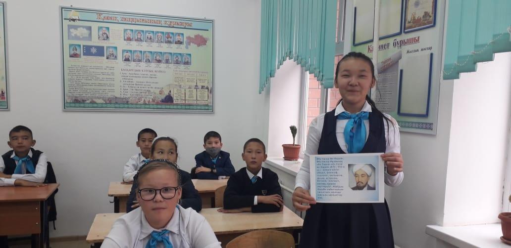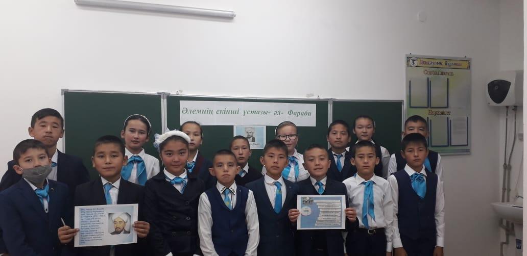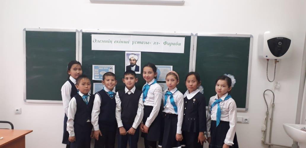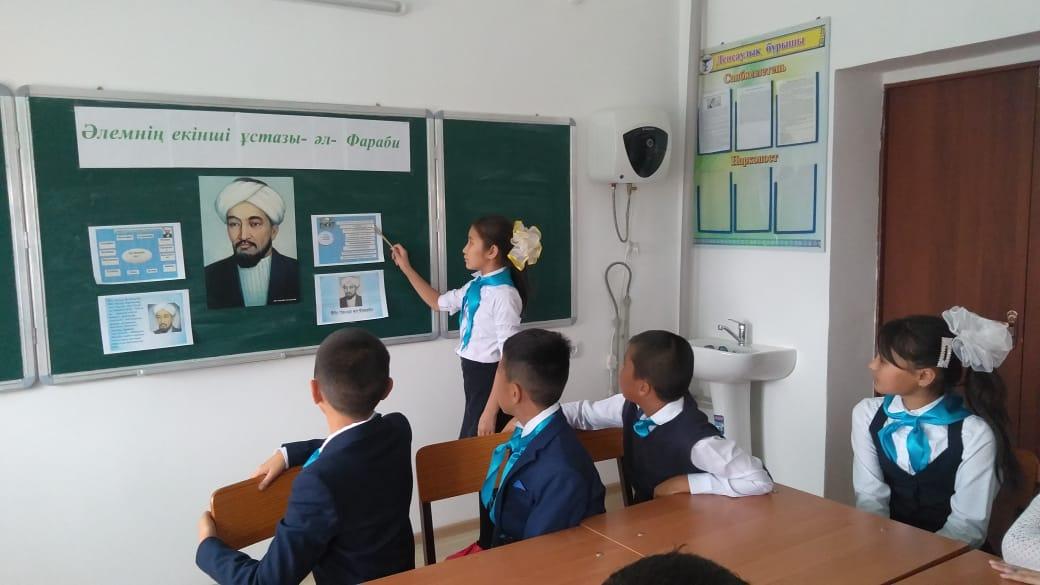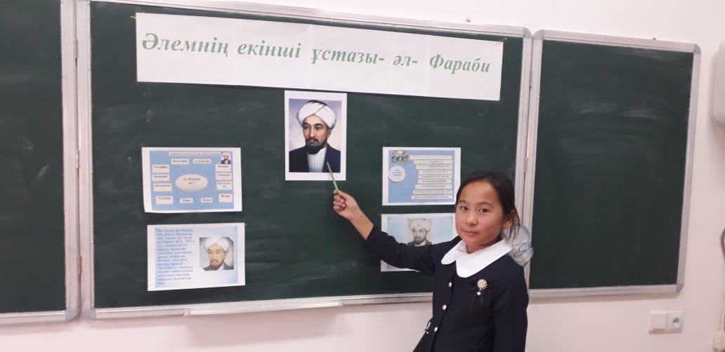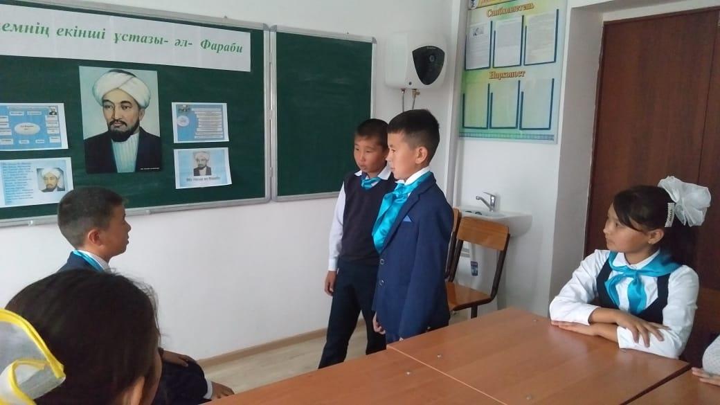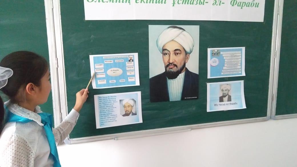 2019 жылдың 1 қарашасы күні жоғарғы сыныптарды күзгі демалыс іс-шарасына сәйкес, «Әлемнің екінші ұстазы –әл-Фараби» тақырыбында тренинг болды. Оқушыларға Аристотельден кейінгі екінші ұстаз Әл-Фараби өмірі,еңбек жолы туралы түсінік беріп, ғұламаның жан-жақты ерекше тұлға болғандығын анықтау мақсатында ізденіс жүргізу,халқымызға білімнің, ілімнің нәрін сепкен аса ірі тұлға Әбунасыр әл-Фараби мұраларынан нәр ағызып, оқушыларды туған жерге деген сүйіспеншілікке, адамгершілікке, қасиетті нәрселерді қадір тұтуға тәрбиелеу мақсатында ұйымдастырылған бұл шарада оқушылар ғұлама туралы біраз мағлұмат алды. Аңыз ізі бойынша көрініс көрсетіп,ой-пікірлерін ортаға салды.