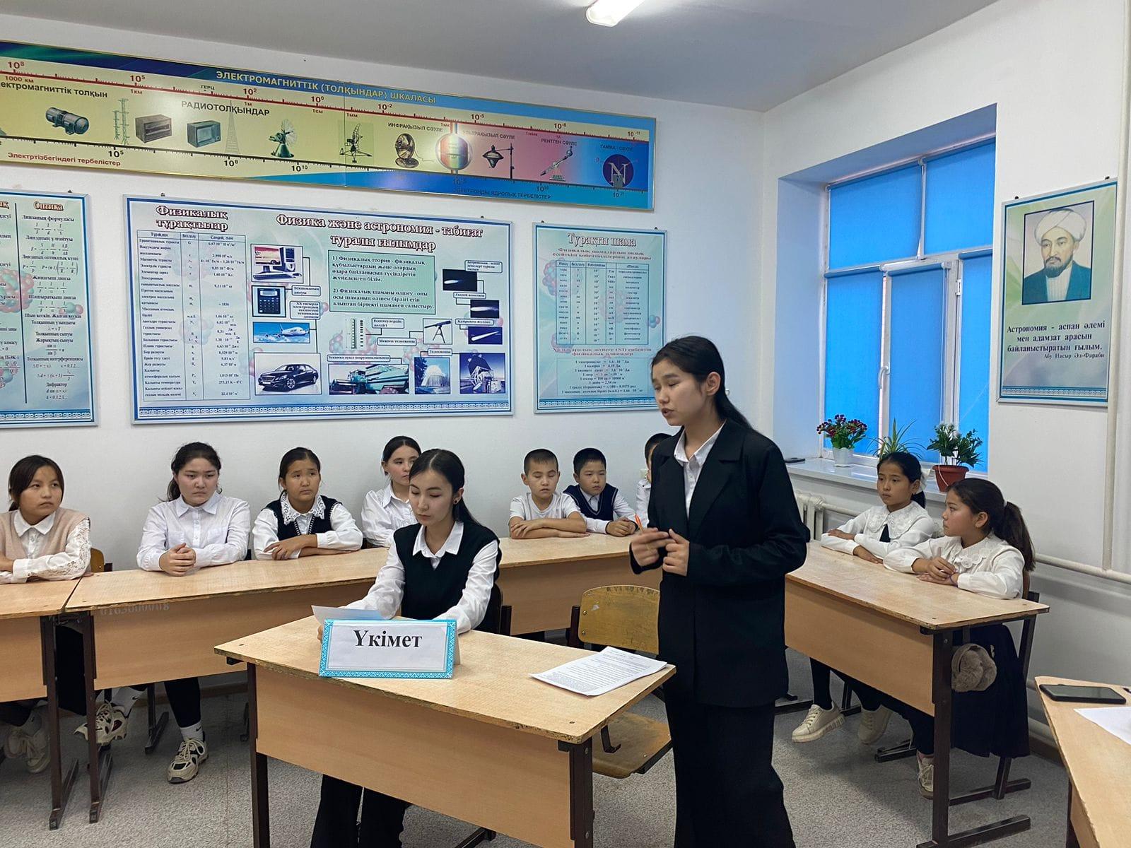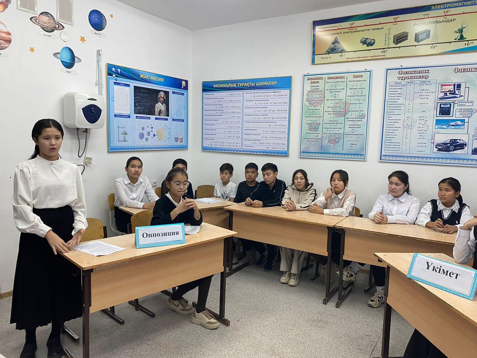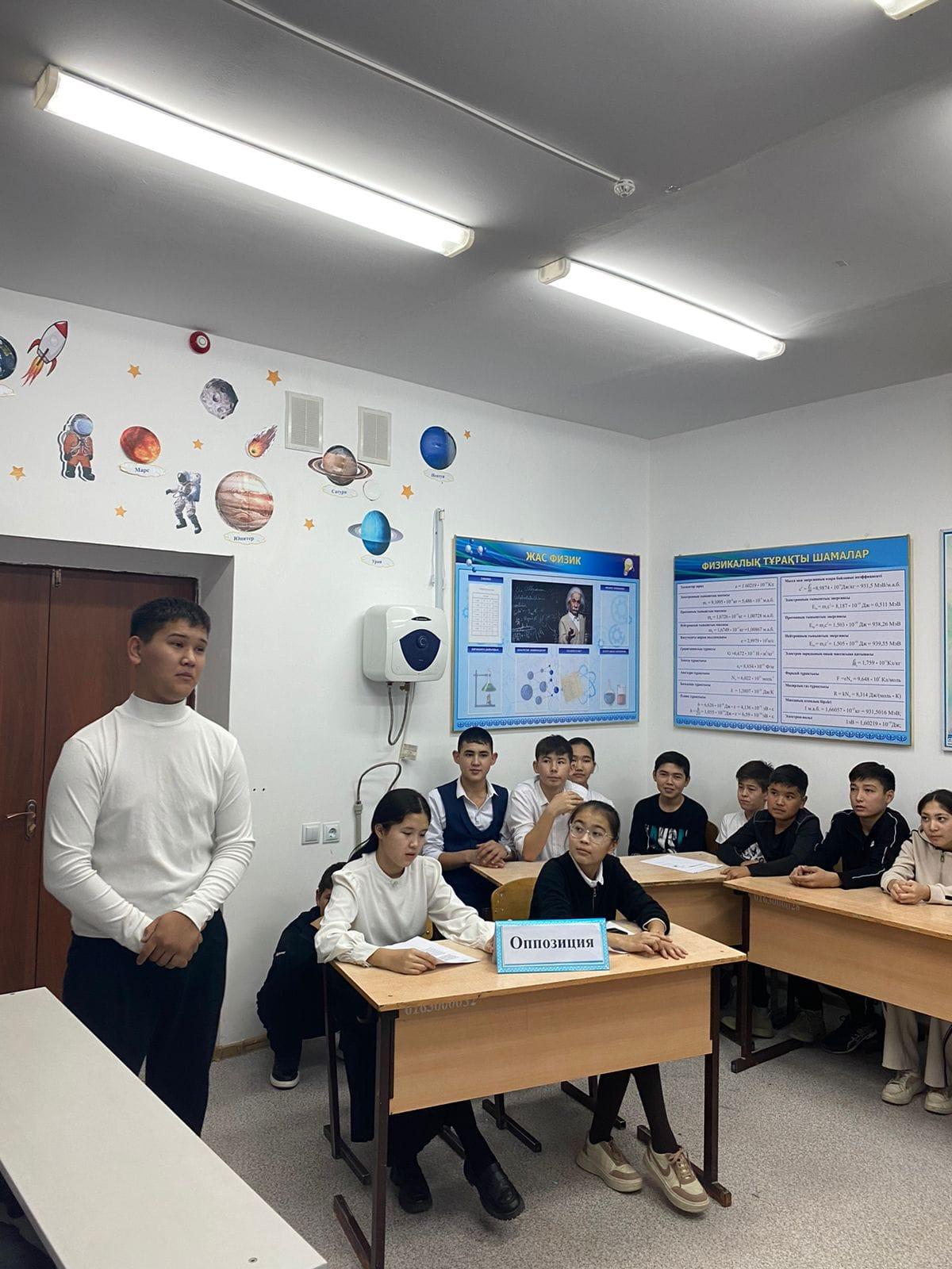 Дебатқа 8 сынып оқушылары Асылбекқызы Сұлтанай мен Тілеухан Шұғыла және 10сынып оқушылары Аятбек Қарақат пен Бейбітшілік Ділназдар қатысып, "Үкімет"және "Оппозиция" тобы бойынша пікірталас өрбіді Ойын өте қызықты және тартымды өтті. Ойынға қазылық жасаған математика пәнінің мұғалімі Н. Шораева мен директордың тәрбие ісі жөніндегі орынбасары Б. Нысанбаев ойынды қорытындылай келе 10 сынып оқушылары Аятбек Қарақат пен Бейбітшілік Ділназды жеңімпаз деп таныды.