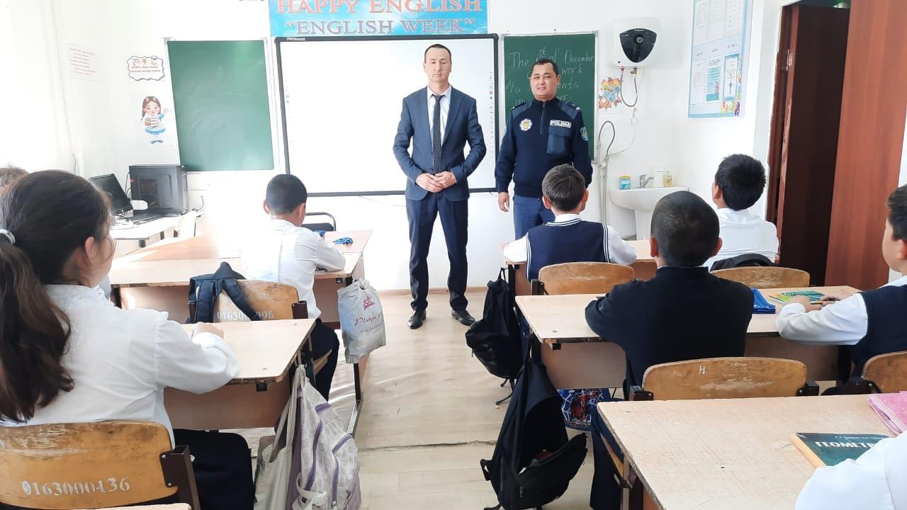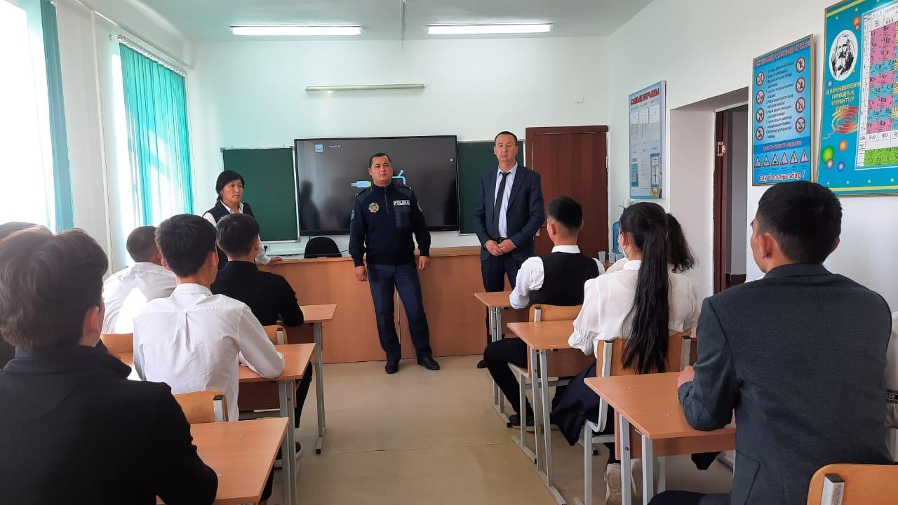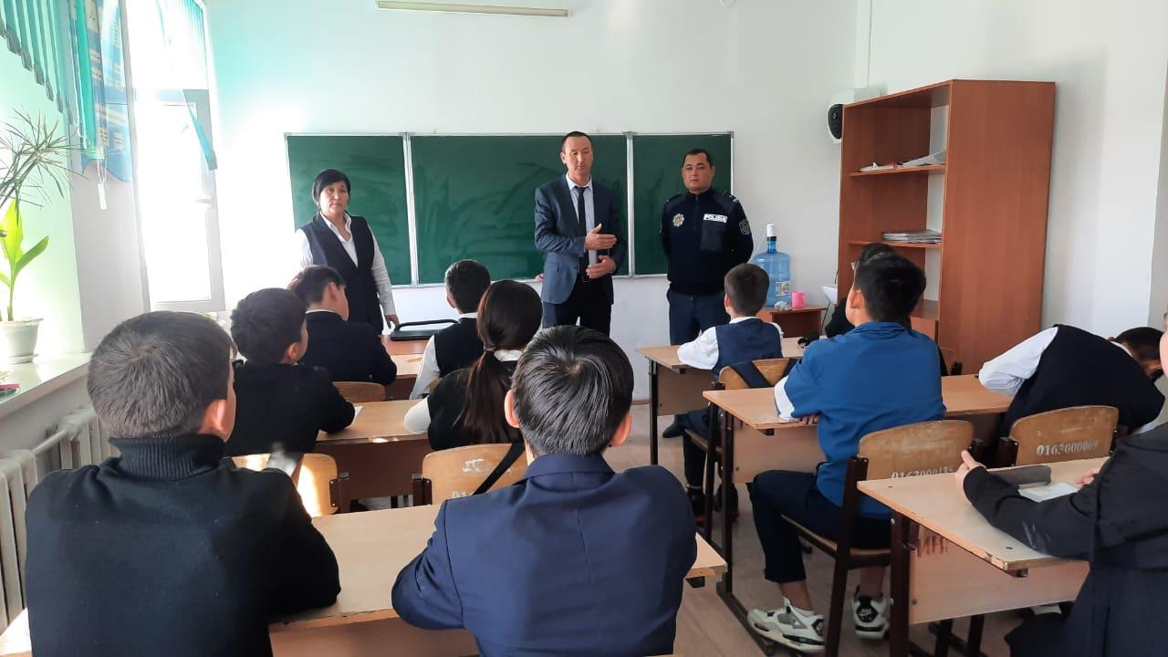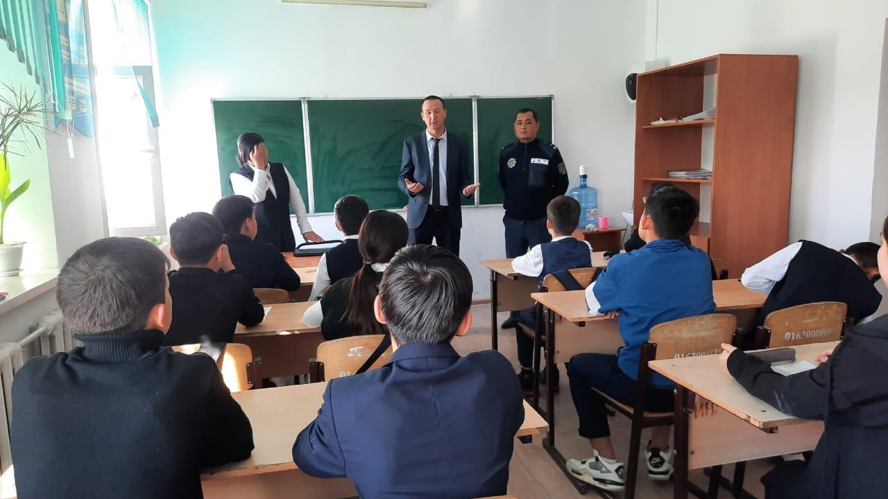 Оқушылар арасында әлімжеттік, беймезгіл уақытта көшеде жүру, кәмелет жасына толмай көлік жүргізу секілді мәселелер бойынша оқушыларға заң төңірегінде түсіндірме жұмыстарын жүргізіп өтті.
