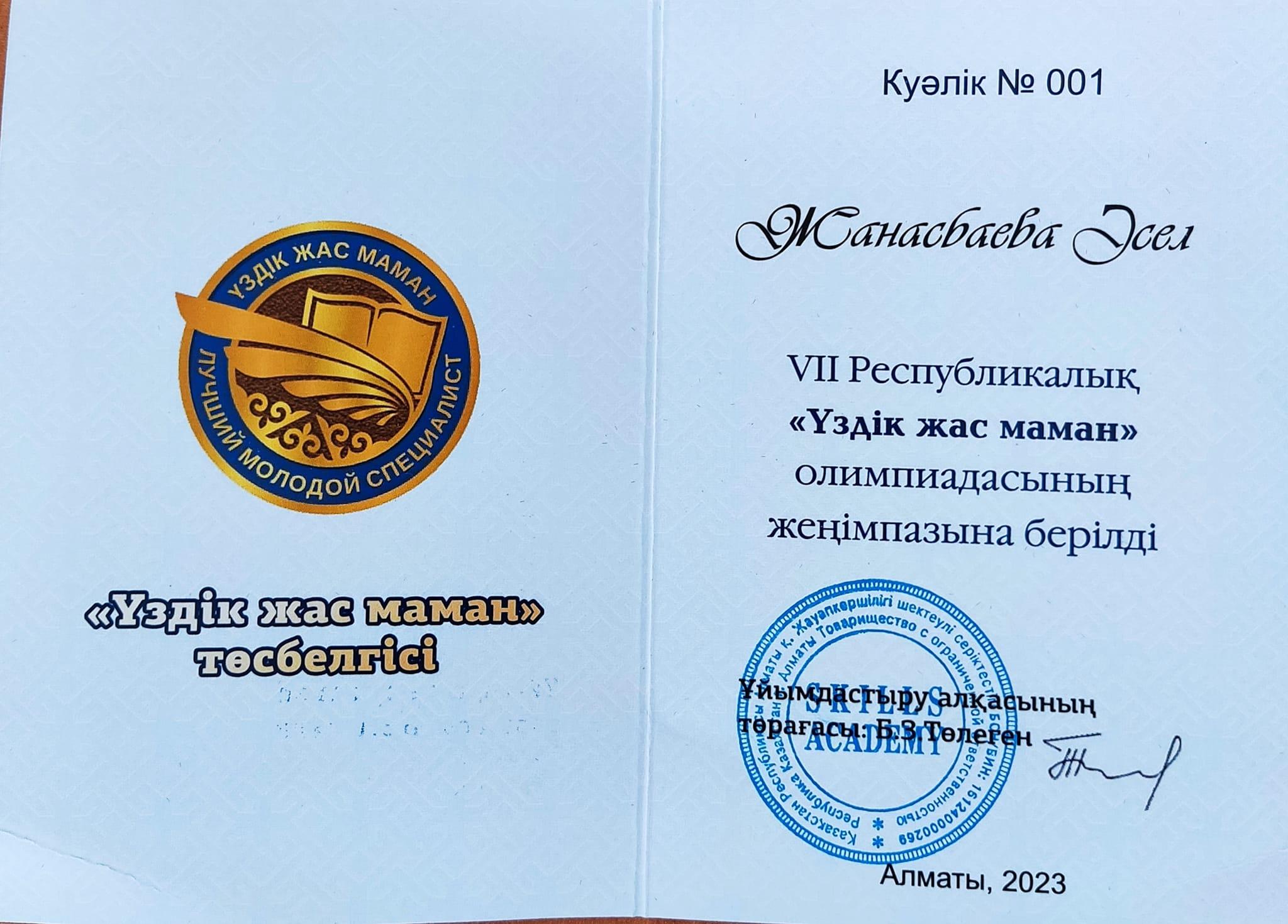 ең жоғарғы нәтижелі көрсеткішпен үздік деп танылған Жанасбаева Әсел Жиренбайқызы «Үздік жас маман» төс белгісімен марапатталды.