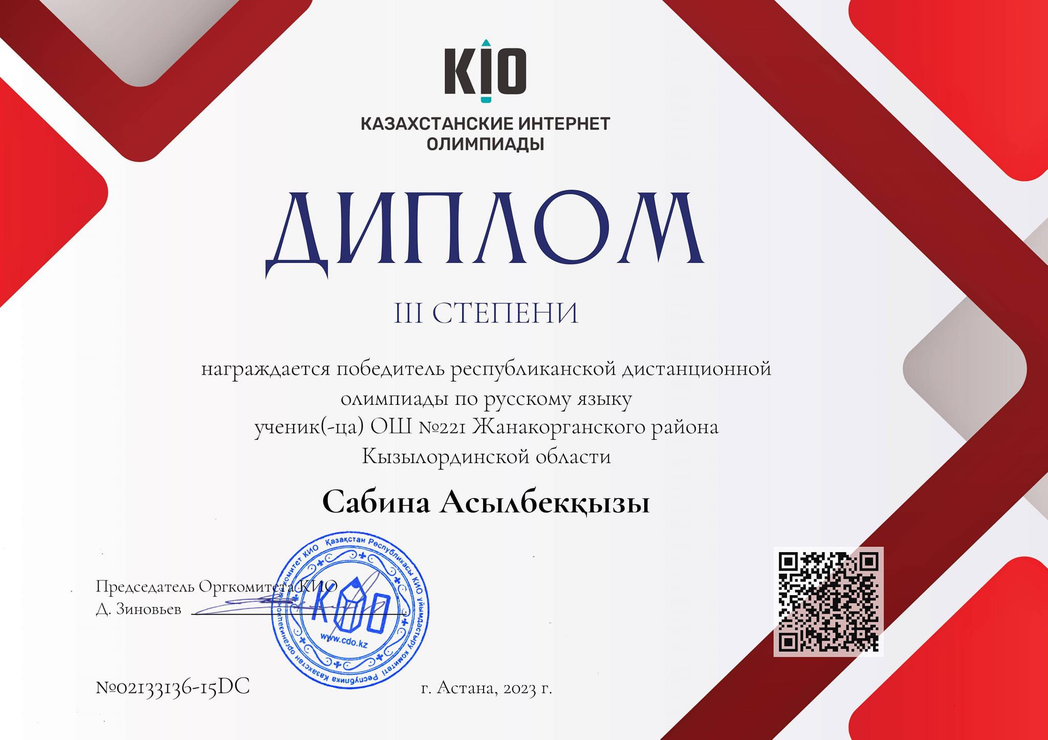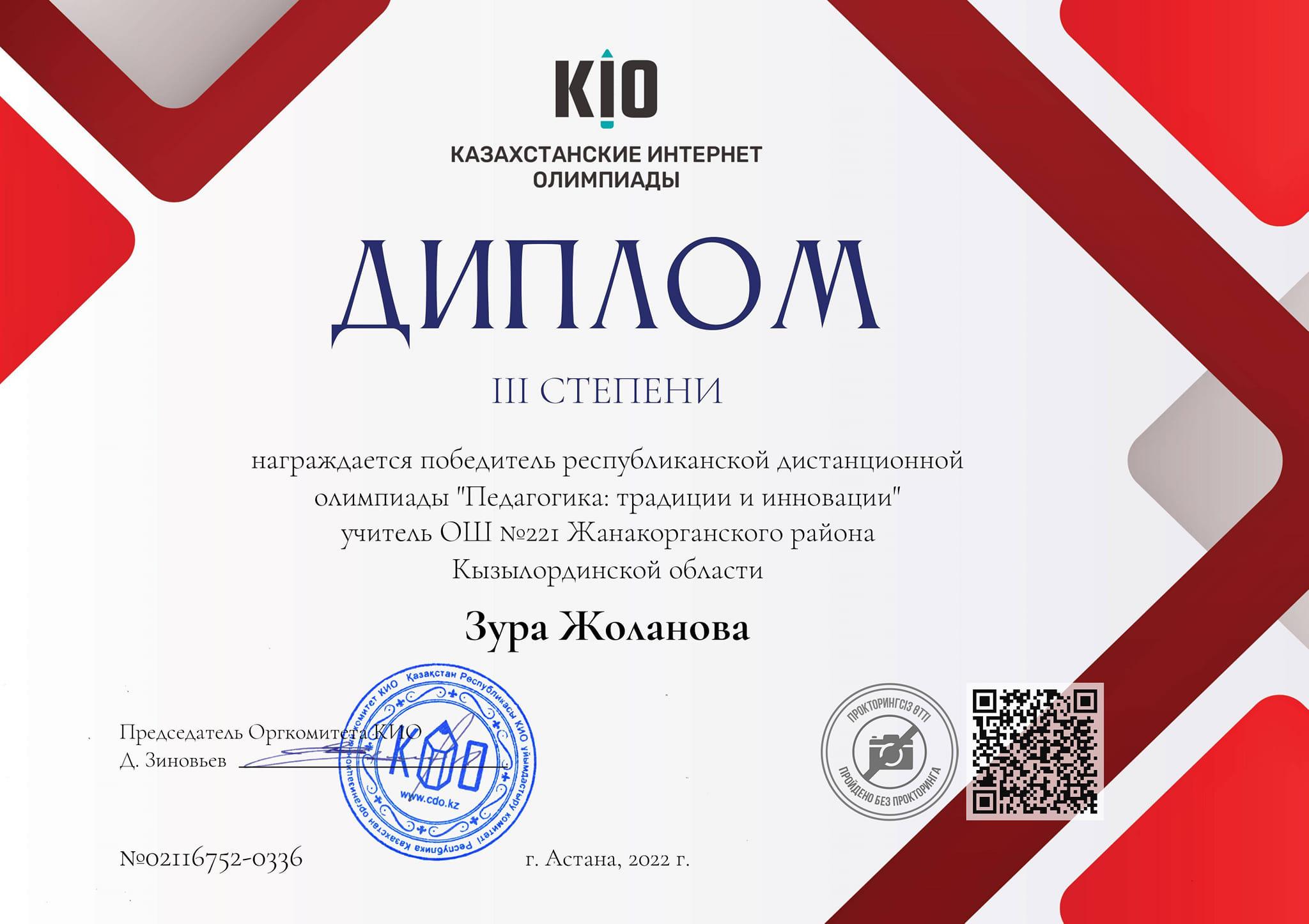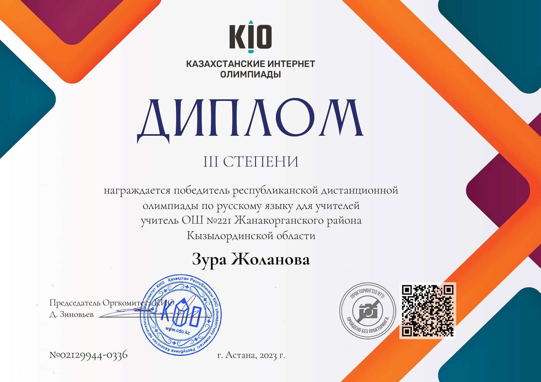 №221 жалпы орта білім беретін мектебінің білімі мол, шәкірттеріне өнеге бола білген орыс тілі мен әдебиеті пәнінің мұғалімі, ардақты ұстаз Жоланова Зура орыс тілі пәнінің мұғалімдеріне арналған «КИО» Республикалық қашықтық олимпиадасының аудандық және облыстық кезеңінен жүлделі орындарға ие болды.