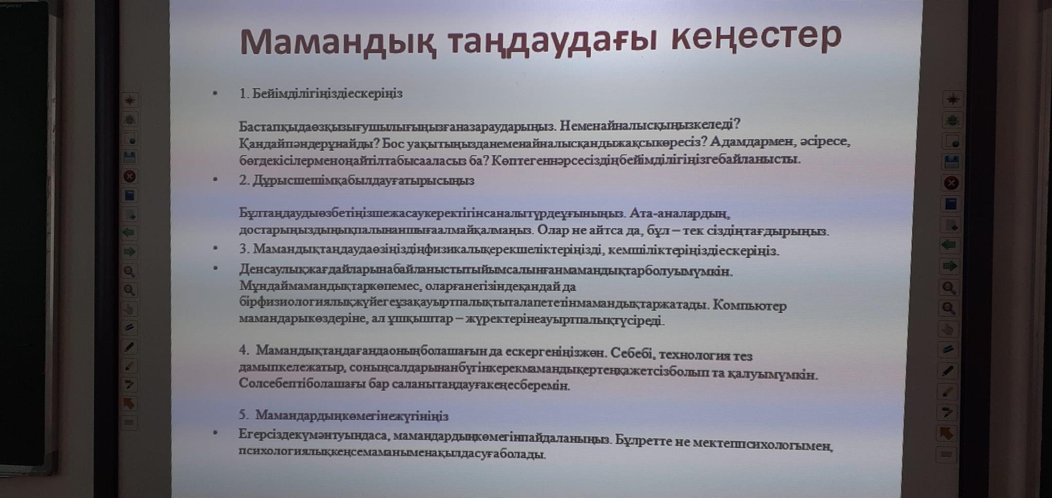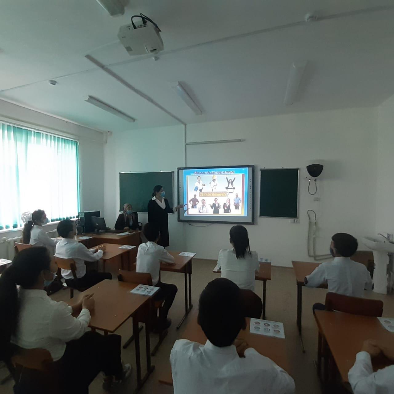 2021 жылы желтоқсан айында N221 негізгі орта мектебінде педагог-психолог Г.Сейтова мен бейінді оқыту ісі жөніндегі орынбасарының міндетін атқарушы М.Бердіхожаеваның ұйымдастыруымен 9-сынып оқушыларына "Мамандықтың адам өміріндегі маңызы" тақырыбында кеңес берілді, шара барысында баяндама оқылды, топтық кеңестер берілді, әңгіме-сұхбат жүргізілді.