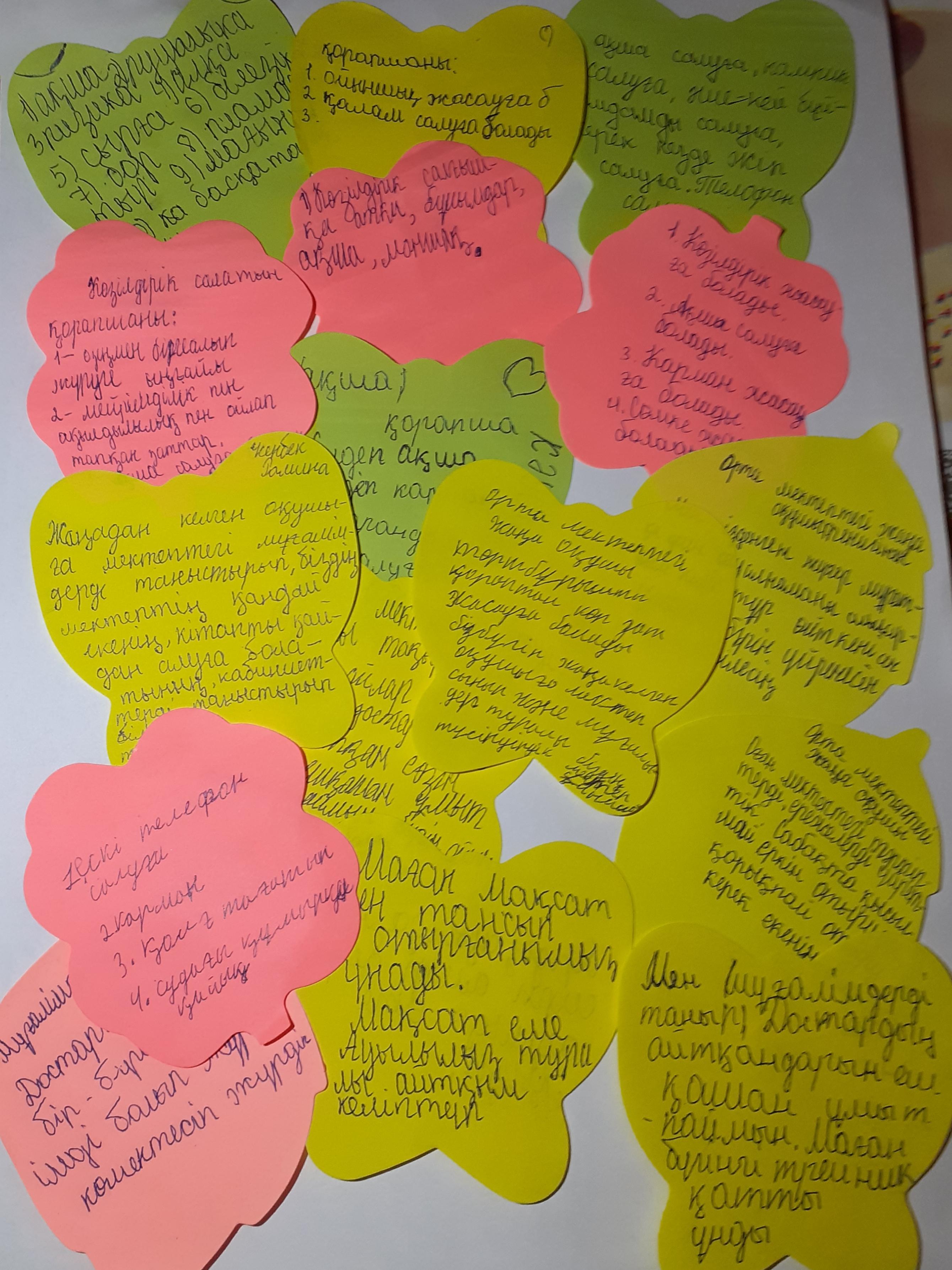 Тренинг барысында оқушыларға мақсаты мен міндеті, сабақтың барысы таныстырылып, оқушылар тренингке жұмылдырылды. Тренинг ережелері ауызша еске түсірілді. Сабақ барысында «Қиялдау» жаттығуы орындалды. Жаттығуда көзілдірік қорапшасы көрсетіліп, қорапшаны көзілдіріктен басқа қандай зат ретінде қолдануға болатыны сұралды. Оқушылар түрлі варианттарды атап өтті де, соның ішінде Оразхан мен Дананың жауабы жеңімпаз аталды. Оқушылар келесі кезекте сыныпқа, мектепке көмектесе алатын өздерінің ең қызықты ережелерін атады. Ең керемет ережеге «Бір микрофон» ережесі жатқызылды. Оқушылар тренигке белсене қатысты.