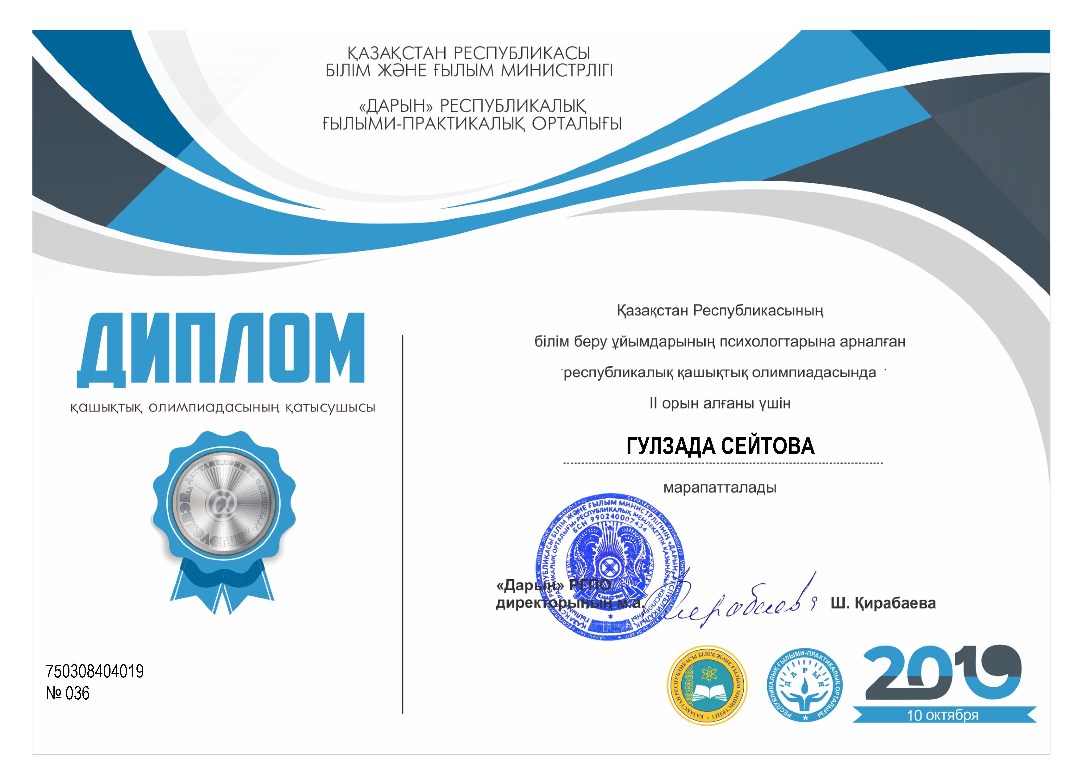 10 қазан 2019 жылы "Дарын" республикалық ғылыми-практикалық орталығының ұйымдастыруымен психологтарға арналған республикалық қашықтық олимпиада болып өтті. Аталған олимпиадаға мектебіміздің педагог-психологы Г.Сейітова қытысып, жүлделі екінші орынға ие болды.