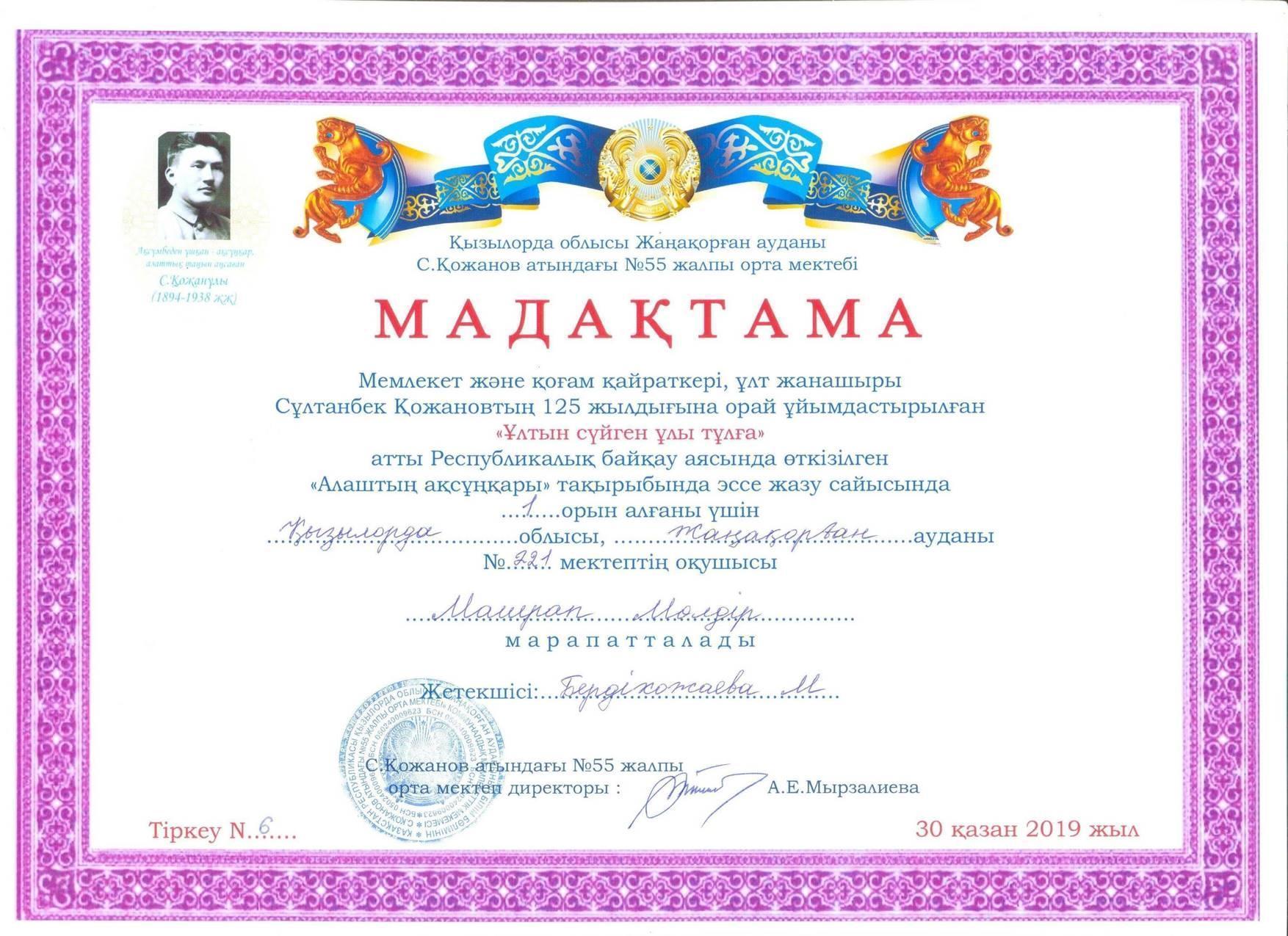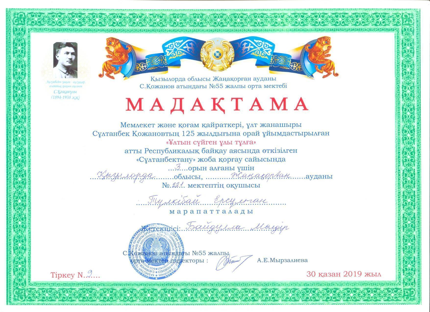 2019 жылдың 30 қазаны күні Қызылорда облысы Жаңақорған ауданы Бірлік ауылындағы №55 С.Қожанов мектебінде С.Қожановтың 125 жылдық мерейтойына арналған «Ұлтын сүйген ұлы тұлға» тақырыбында республикалық байқау өткізілді. С.Қожановтың өмірі мен шығармашылығын терең тану, оның елі мен жеріне, ұлты мен халқына, күллі түркі дүниесіне жанашырлықпен қараған іс-әрекетін зерделеп, оқушыларға таныту, ұлтымыздың біртуар марғасқасын еске алып, Елбасының «Рухани жаңғыру» бағдарламасы аясында С.Қожановтың өмірін ұрпаққа өнеге ретінде насихаттау мақсатында ұйымдастырылған бұл байқауда «Алаштың ақсұңқары» тақырыбындағы эссе жазу бөлімі бойынша мектебіміздің 9-сынып оқушысы М.Машрап І орын, «Ұлтын ұлықтаған қайраткер» атты жас ақындар мүшайрасы бойынша 9-сынып оқушысы А.Аятбек Алғыс хат, «Сұлтабектану» атты жас ғалымдардың ғылыми жоба қорғау сайысында 9-сынып оқушысы Түлкібай Ерсұлтан ІІІ орын иегерлері атанды. Оқушыларды дайындап, бәйгеге қосқан жетекші мұғалімдер қазақ тілі мен әдебиеті пәнінің мұғалімі М.Бердіқожаева және тарих-география пәндерінің мұғалімі М.Байдулла.