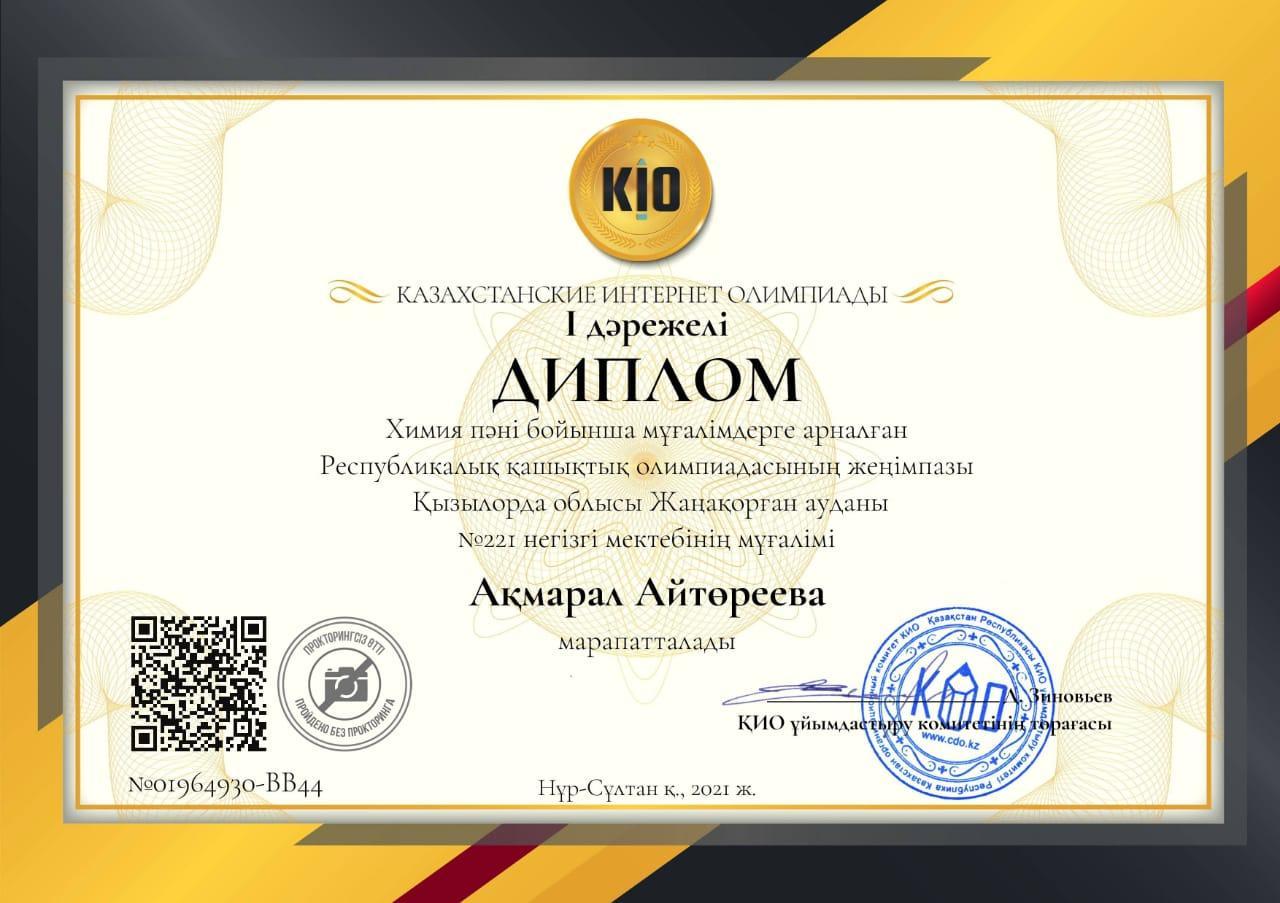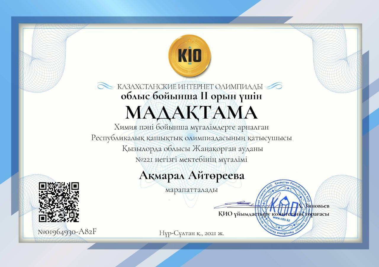 16 апрель 2021 0 1 2 3 4 5 Химия пәнінен олимпиада жеңімпазы Қазақстан интернет олимпиадасын орталығы ұйымдастырған республикалық химия пәнінен мұғалімдер арасында өткен олимпиада жеңімпазы болған химия-биология пәнінің мұғалімі А.Айтөрееваны құттықтаймыз.