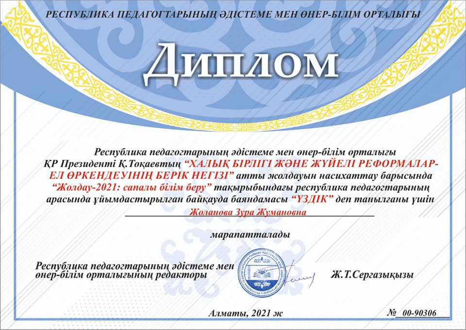 Қызылорда облысы Жаңақорған ауданы Аққұм ауылы #221 негізгі орта мектебінің орыс тілі мен әдебиеті пәнінің мұғалімі Жоланова Зура Жумановна Президент Қ. К. Тоқаевтың " Халық бірлігі және жүйелі реформалар - ел өркендеуінің берік негізі " атты жолдауын насихаттау мақсатында " Жолдау - 2021: сапалы білім беру " тақырыбында өткізілген Республикалық педагогтар арасындағы байқауда баяндамасы " Үздік " деп танылды.