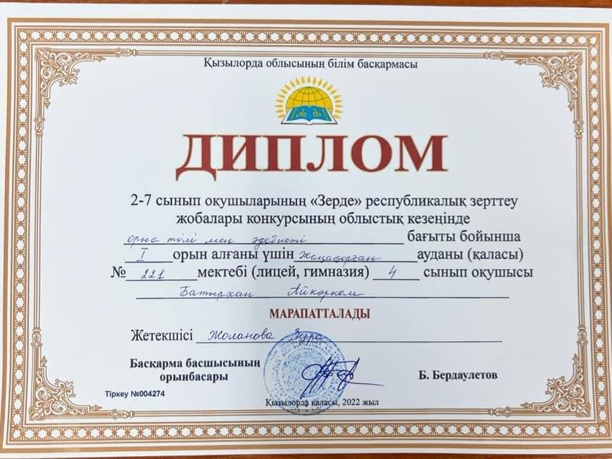 №221 жалпы орта білім беретін мектебінің 4 — сынып оқушысы Батырхан Айкөркем орыс тілі мен әдебиеті пәнінің мұғалімі Жоланова Зураның жетекшілігімен 2—7 сынып оқушылары арасындағы «Зерде» республикалық зерттеу жобалық конкурсының облыстық кезеңінен жүлделі І орынды иеленді. Биіктен көрініп, білімді, оқуда озат бола бер Батырхан Айкөркем Дарханқызы.