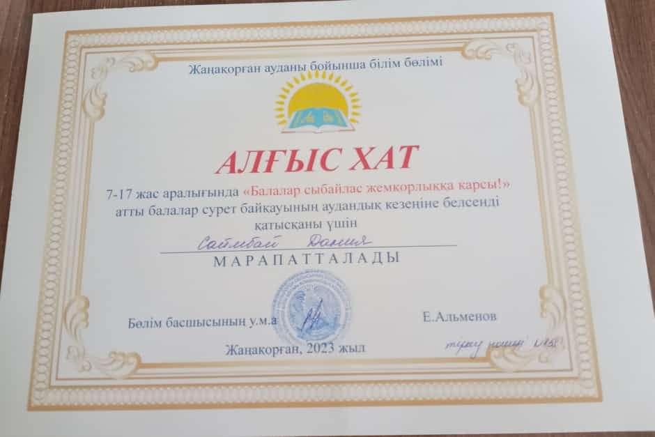 20 қыркүйек күні Жаңақорған ауданында 7-17 жас аралығында "Балалар сыбайлас жемқорлыққа қарсы!" атты балалар сурет байқауының аудандық кезеңіне белсене қатысқаны үшін 6 сынып оқушысы Нұрланқызы Мерей мен 10 сынып оқушысы Саймбай Дания Алғыс хаттармен марапатталды. Жетекшісі: Д.Досманбетова