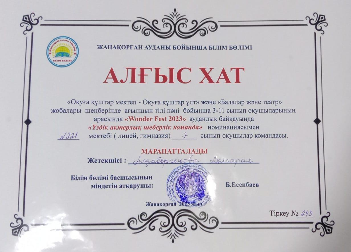 29.11.2023 жылы Жаңақорған ауданында өткен "Оқуға құштар мектеп-Оқуға құштар ұлт" және "Балалар және театр" жобалары шеңберінде ағылшын тілі пәні бойынша 3-11 сынып оқушыларының арасында "Wonder Fest 2023" аудандық байқауына 221 жалпы орта мектебінің 7-сынып оқушылары қатысып,өз өнерлерін көрсетіп,"Үздік актёрлық шеберлік команда" номинацияы бойынша алғыс хат иеленді