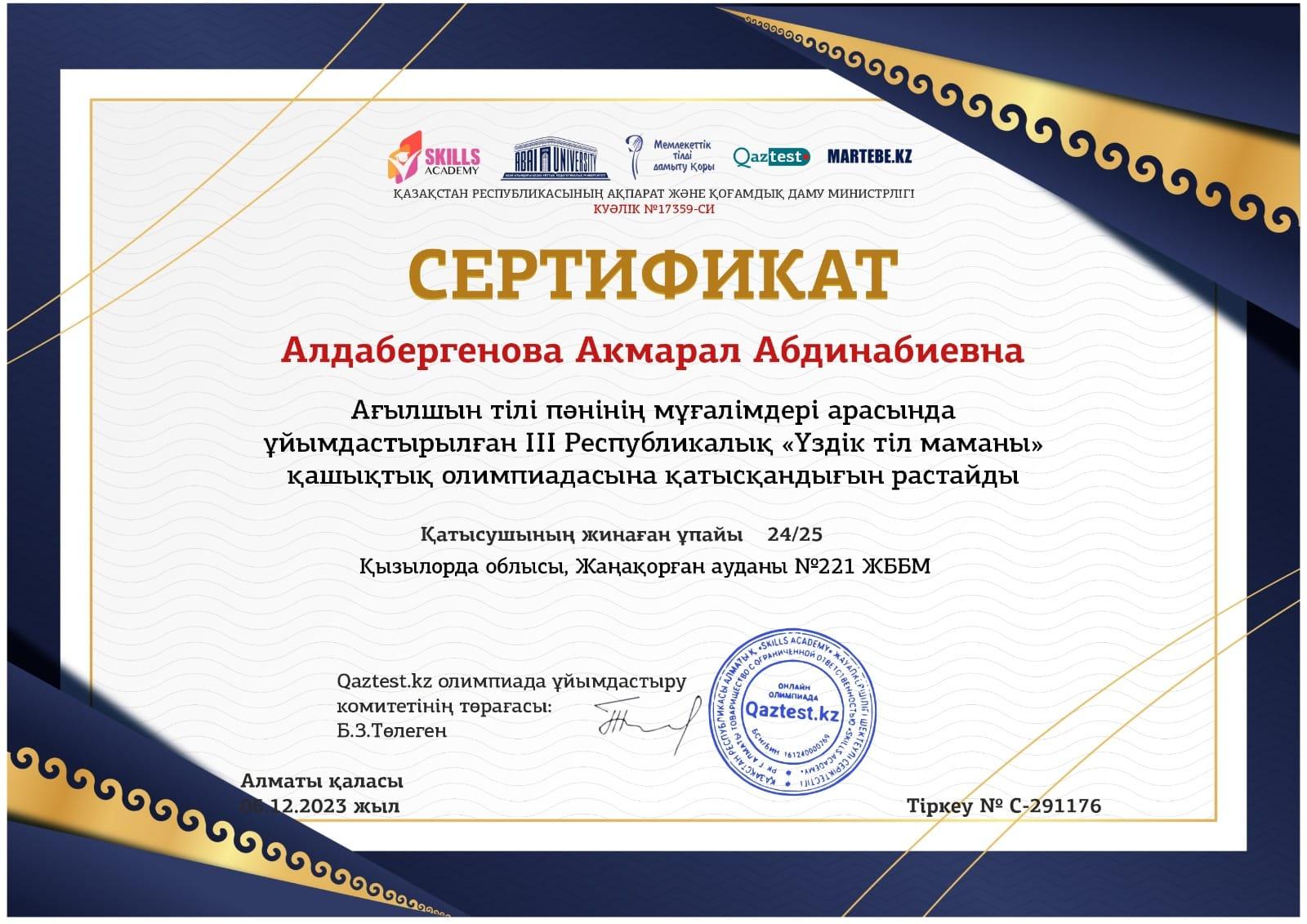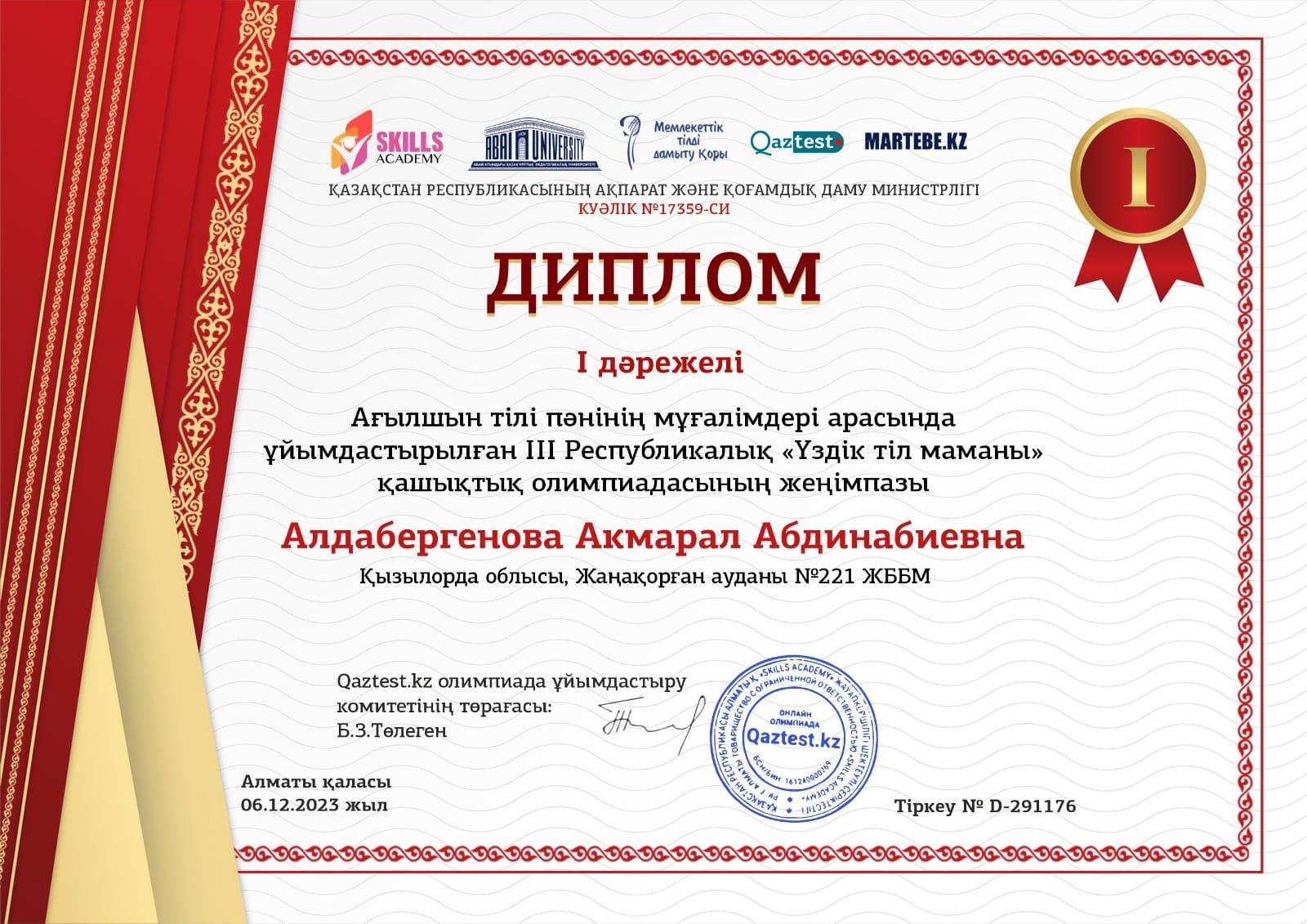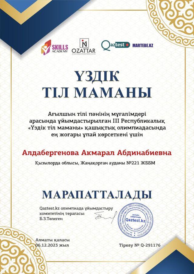 Республикалық Qaztest онлайн олимпиада ұйымдастыру комитеті Абай атындағы ҚазҰПУ-мен жасалған меморандум аясында № 83 хатына сәйкес ағылшын тілі пәнінің мұғалімдері арасында ІІІ Республикалық "Үздік тіл маманы" қашықтық олимпиадасына мектебіміздің ағылшын тілі пәні мұғалімі Алдабергенова Ақмарал қатысып, ең жоғарғы ұпай көрсеткені үшін І дәрежелі диплом және "Үздік тіл маманы" грамотасымен марапатталды.