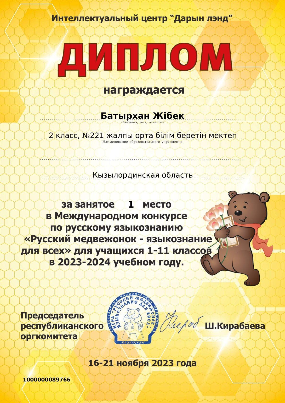 Международный конкурс по русскому языкознанию "Русский медвежонок - языкознание для всех" для учащихся 1-11 классов 2023-24 учебный год. В этом конкурсе ученица 2-го класс Батырхан Жибек заняла І место. Батырхан Айкөркем ученица 5-го класса - ІІ место. Учитель-предметник Жоланова З.Ж