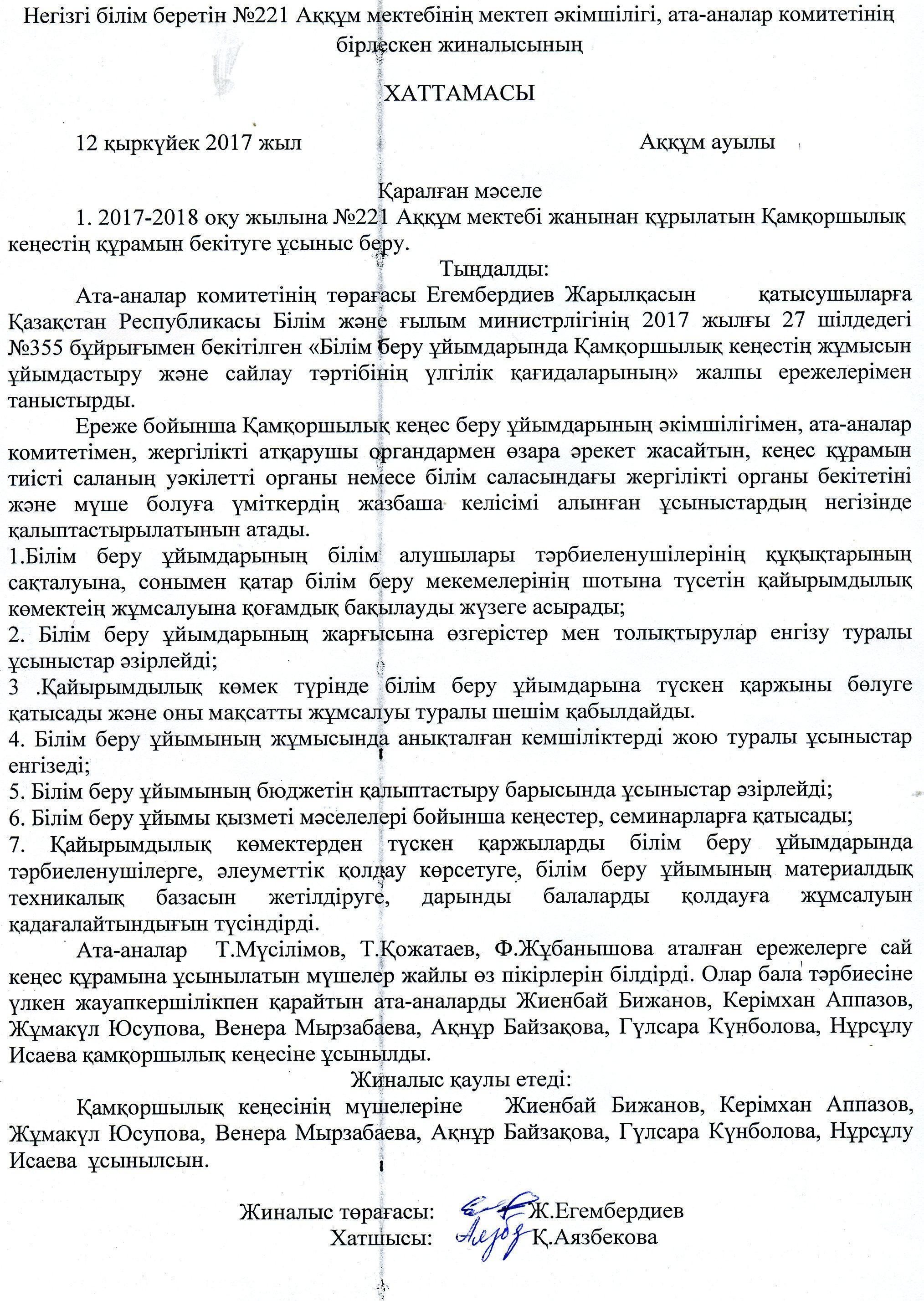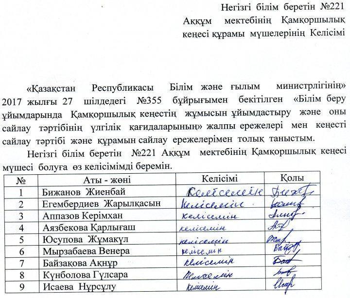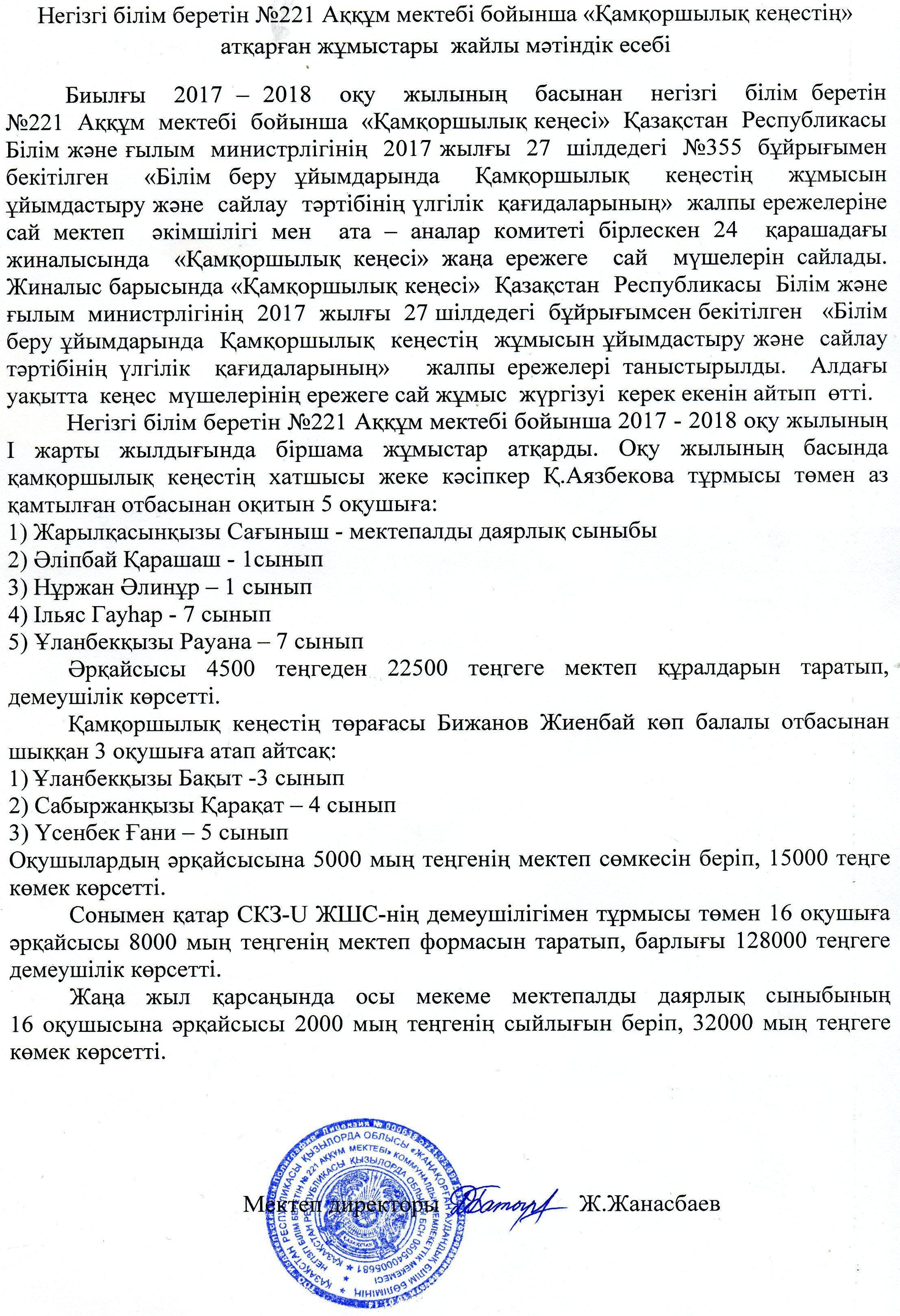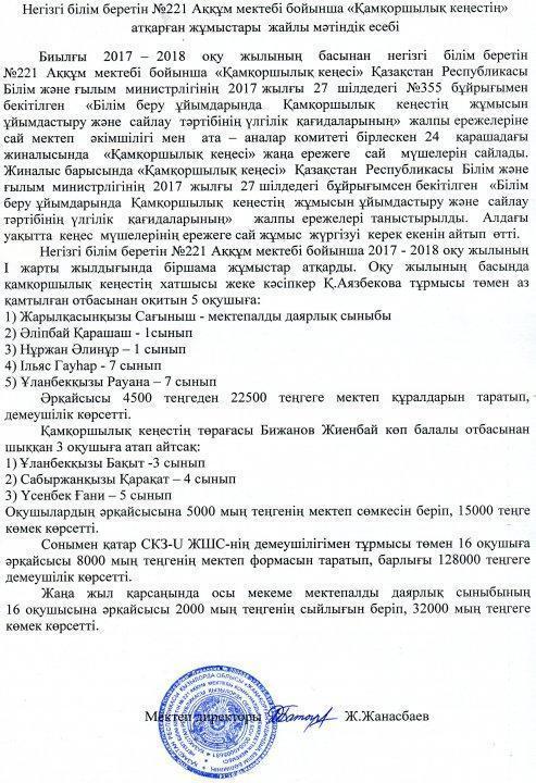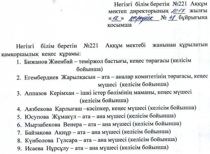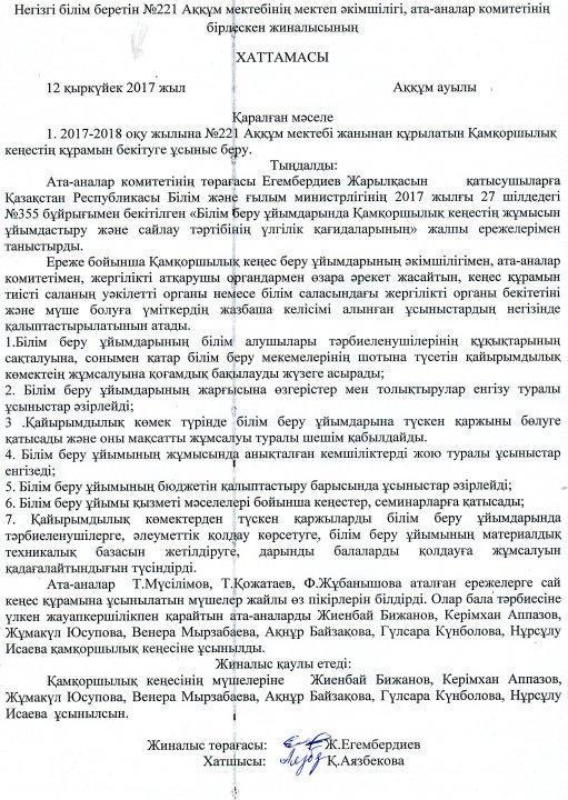 Қамқоршылық кеңестің жұмыстары » №221 орта мектебі