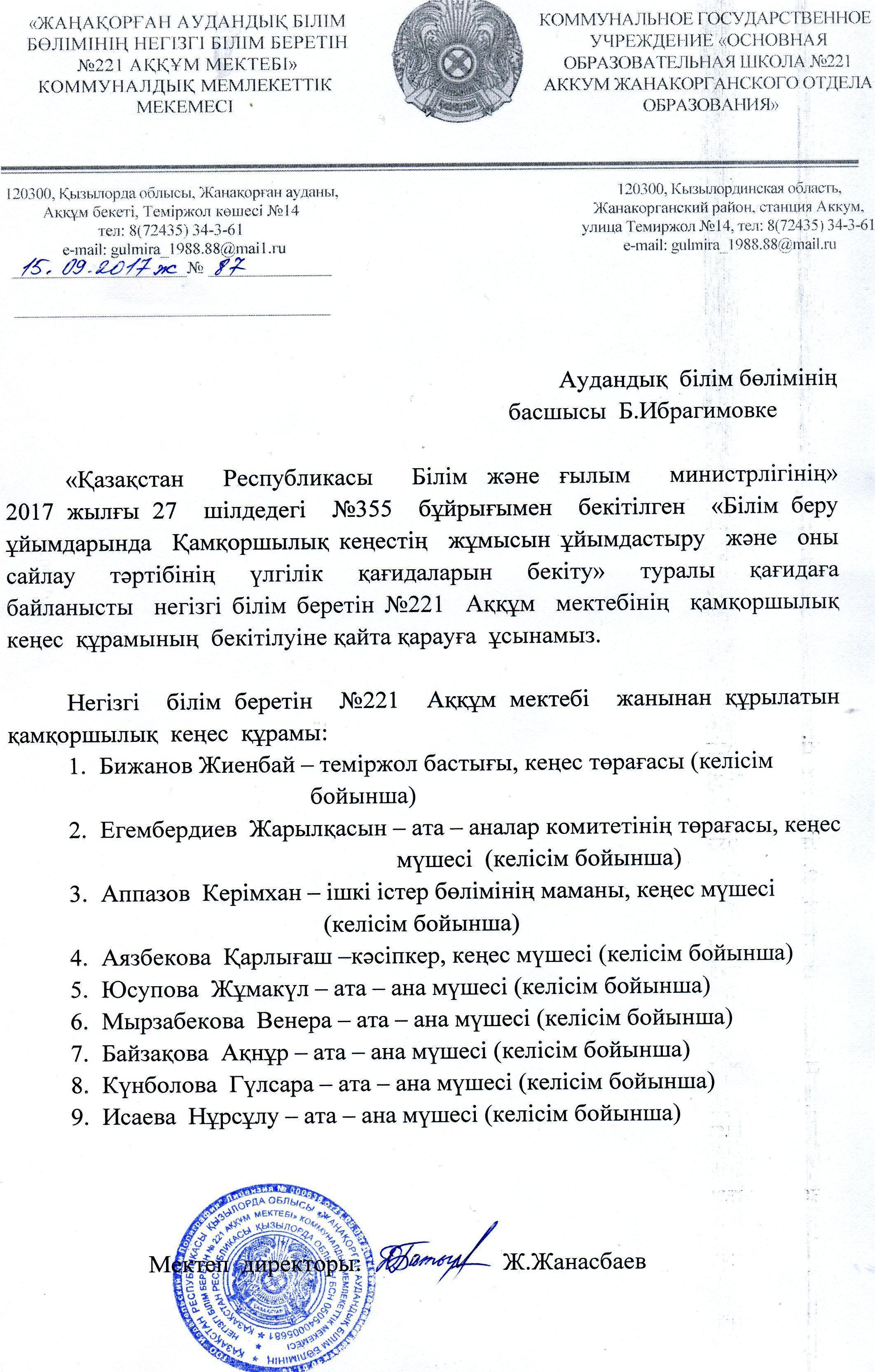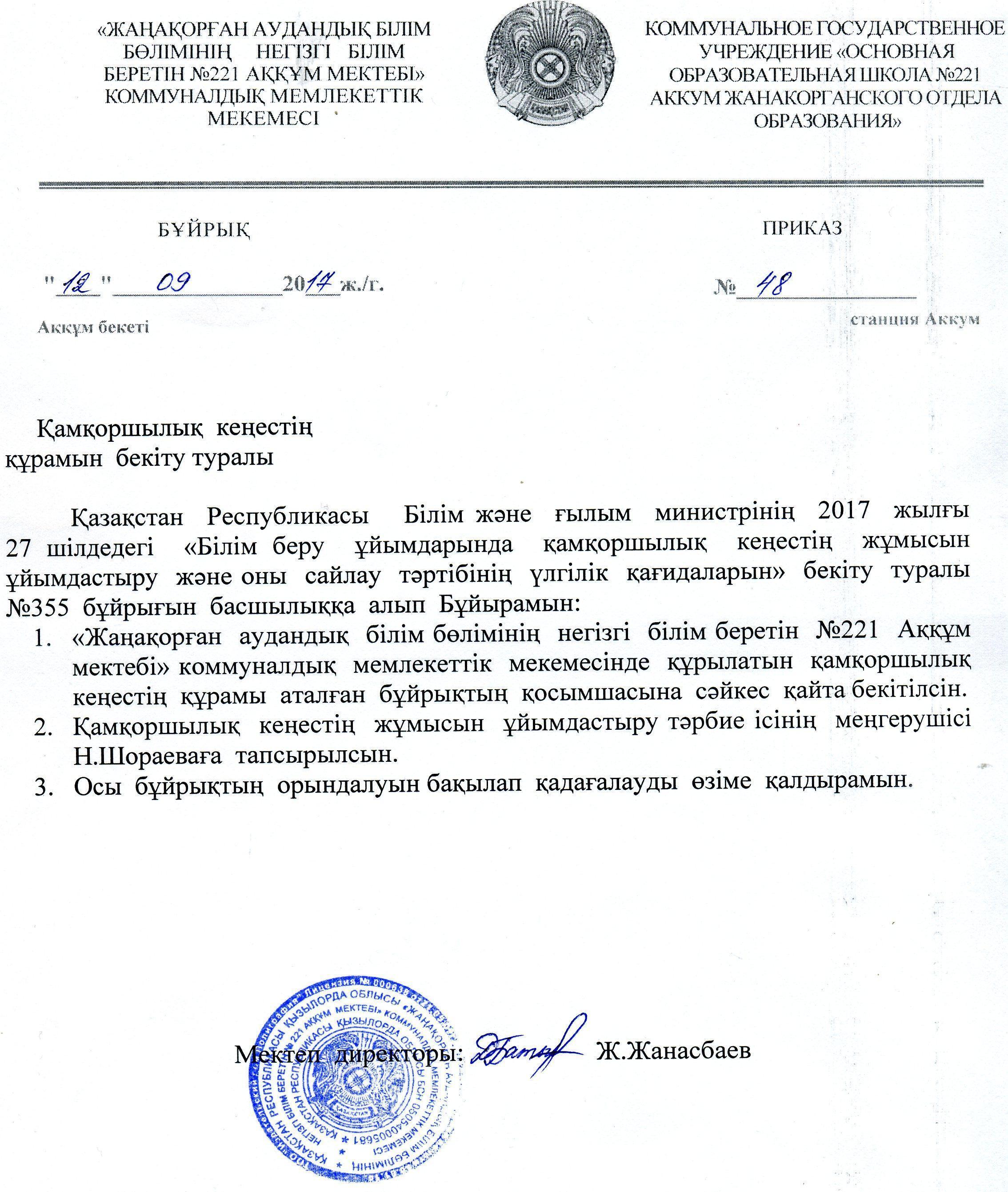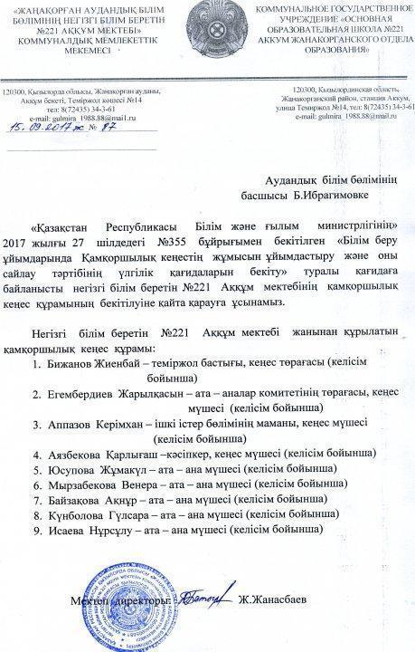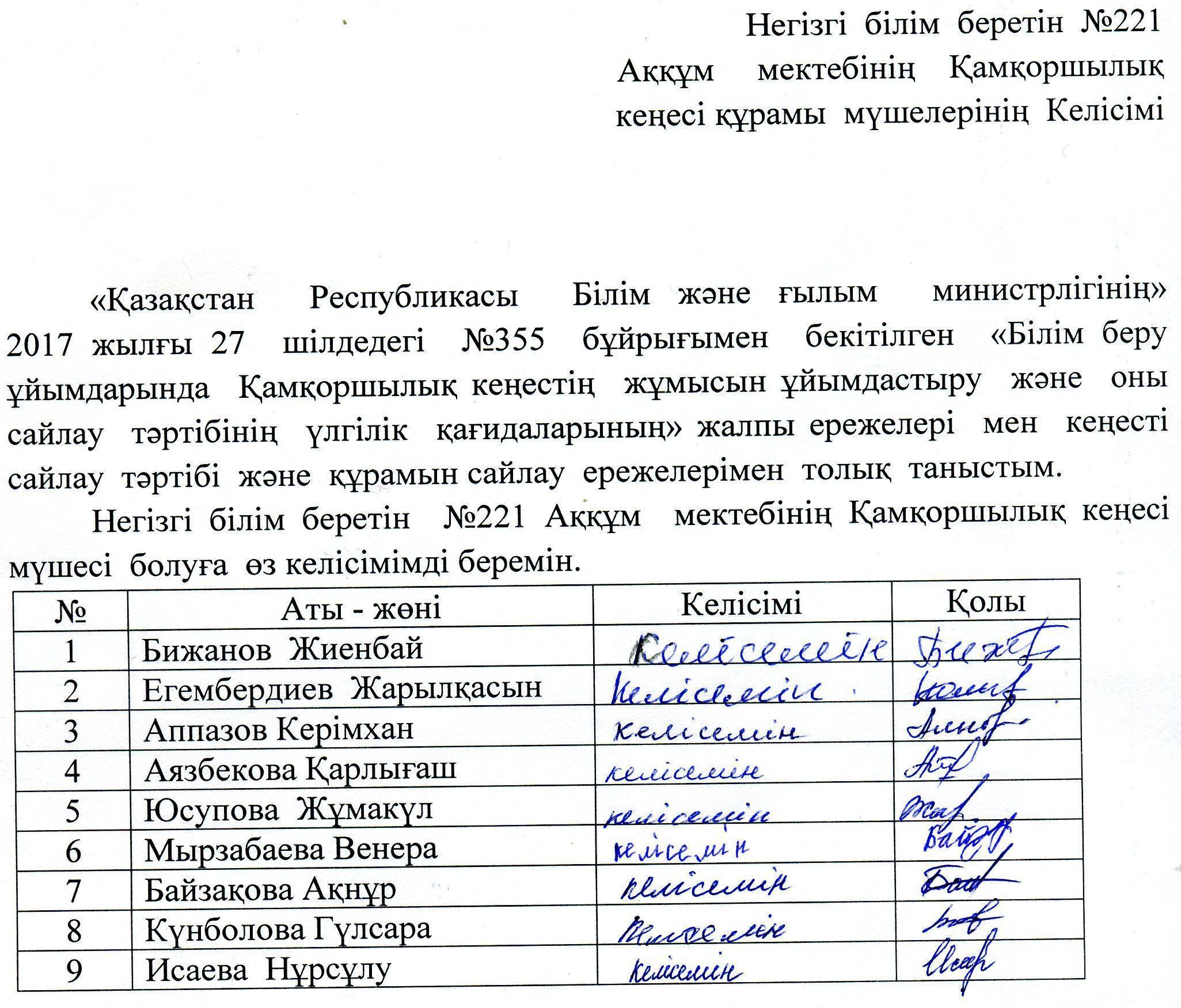 Қамқоршылық кеңестің жұмыстары » №221 орта мектебі