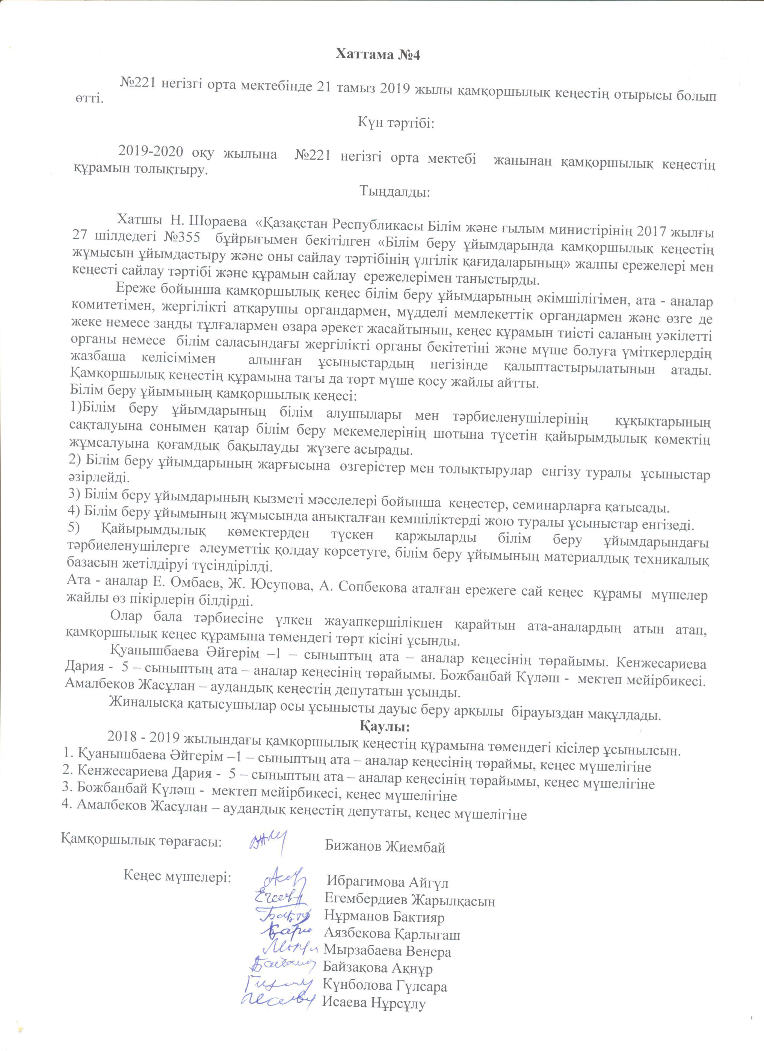 Қамқоршылық кеңестің 4 отырысының хаттамасы 2018-2019 оқу жылы » №221 орта мектебі